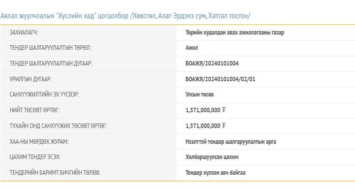 Тодруулбал, Улсын төсвийн хөрөнгөөр Хөвсгөл аймгийн Алаг-Эрдэнэ сумын нутаг дэвсгэр Хатгал тосгонд байрлаах "Хүслийн хад" аялал жуулчлалын цогцолбор байгуулахаар болжээ. Тендерийн төсөвт өртөг нь НЭГ тэрбум 571 сая төгрөг байна. Гэхдээ тендерийн баримт бичигт энэ мөнгийг хэрхэн захиран зарцуулах талаар мэдээлэл багтаагүй байна. Цогцолбор нэрээр тус орчимд ямар ажил хийгдэж, 1.5 тэрбум төгрөгийг хэрхэн захиран зарцуулах нь "нууц" гэсэн үг юм.