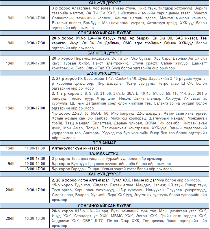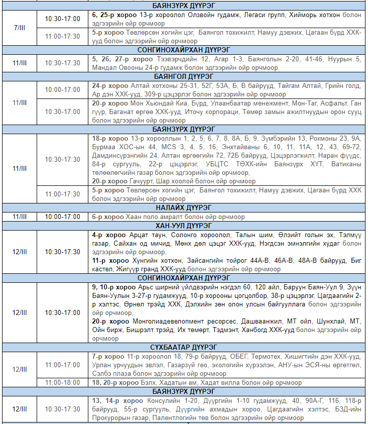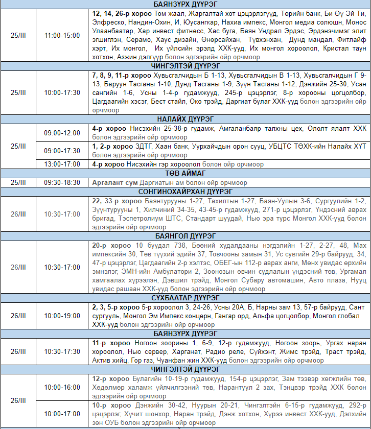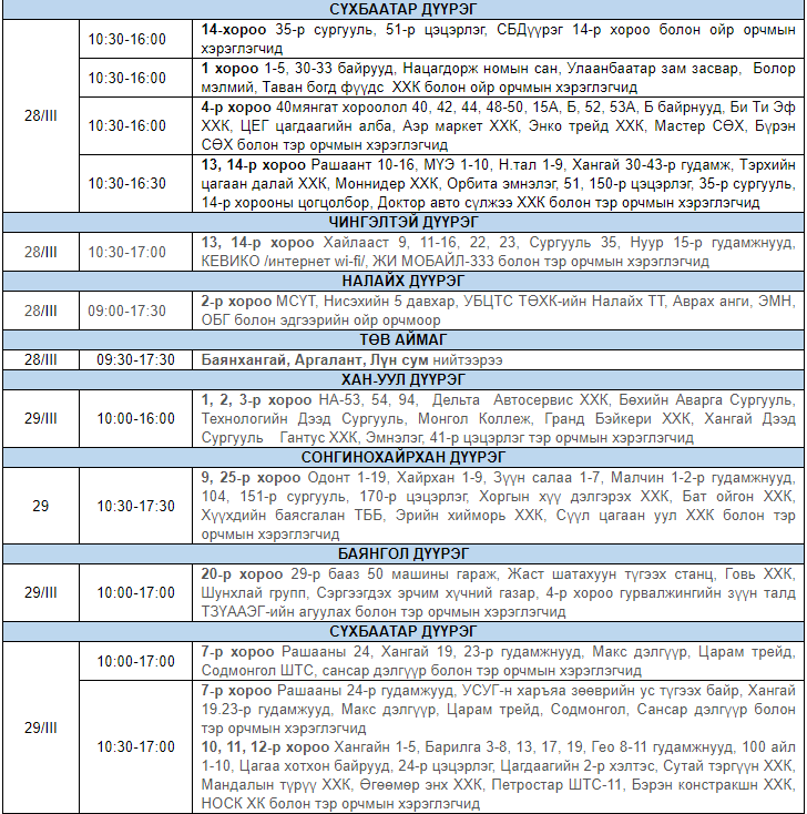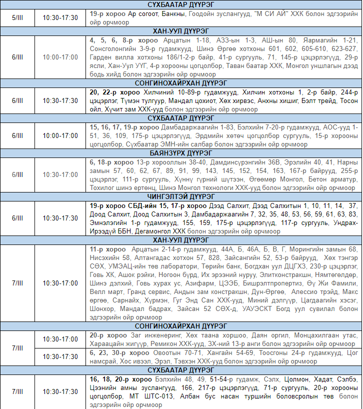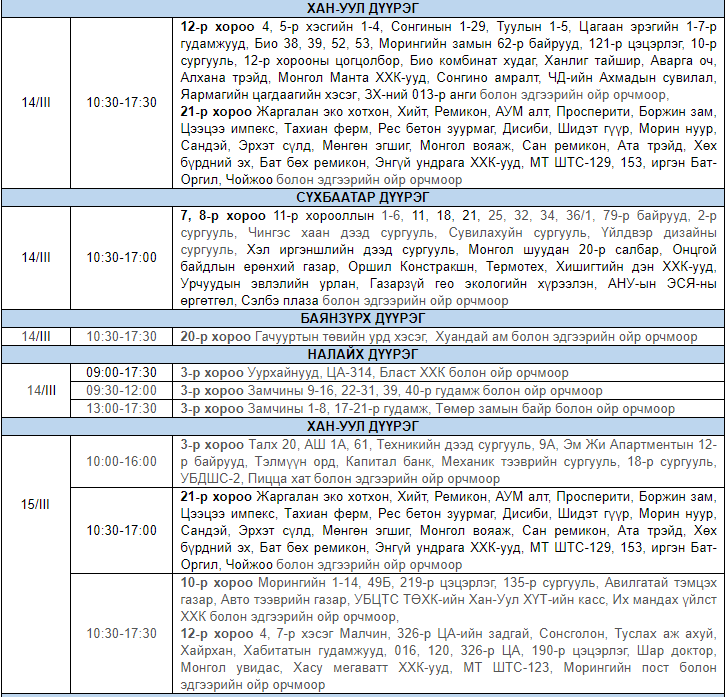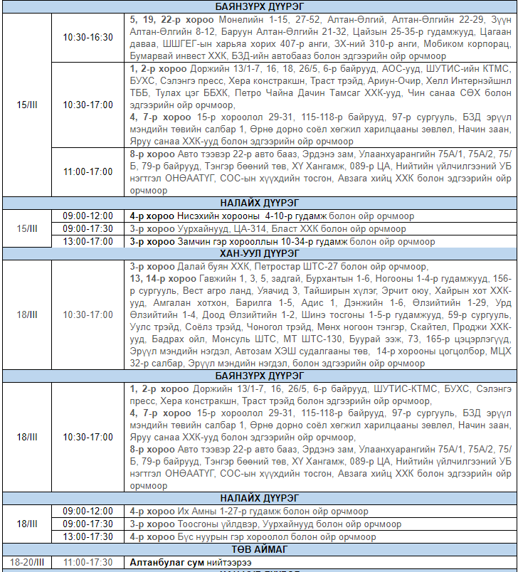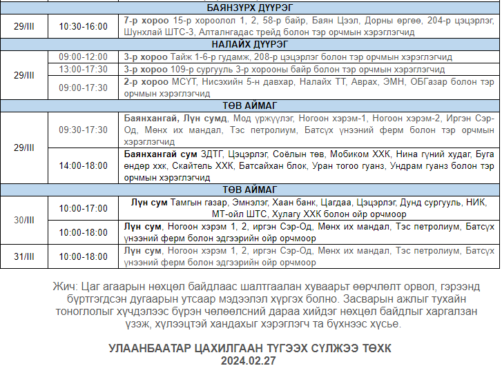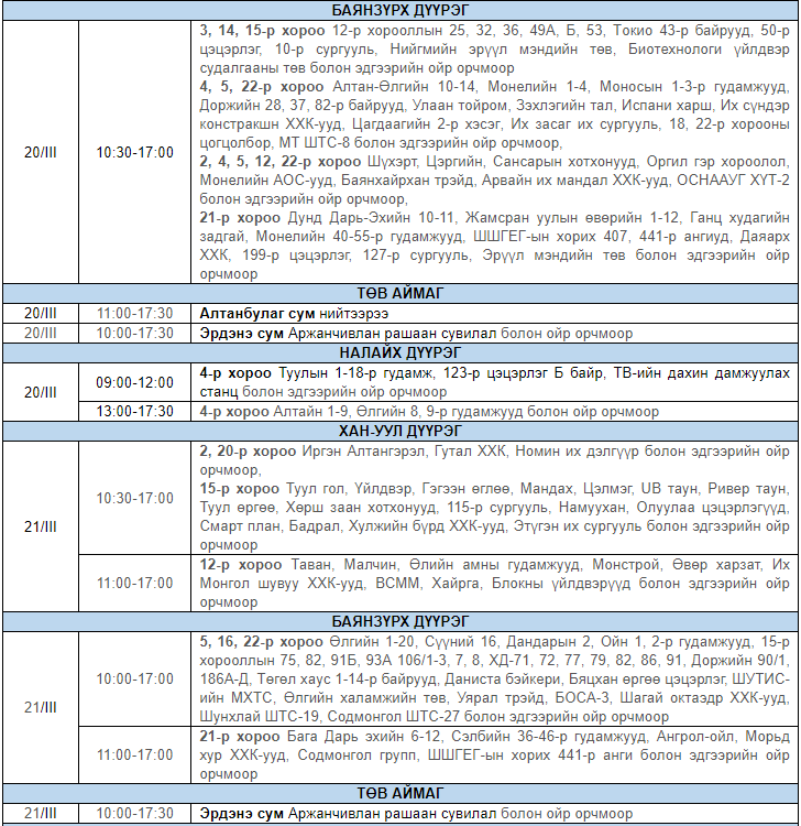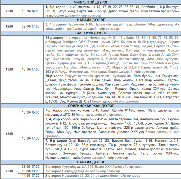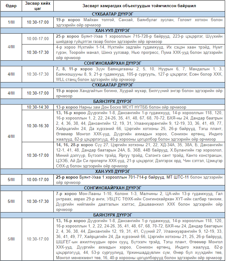 Улаанбаатар цахилгаан түгээх сүлжээ ТӨХК-аас цахилгааны шугам тоноглолд засвар үйлчилгээ хийх гуравдугаар сарын хуваарийг гаргажээ. Засвар үйлчилгээ хийх үед цахилгааныг бүрэн хязгаарлах бөгөөд цаг агаарын нөхцөл байдлаас шалтгаалан хуваарь өөрчлөгдсөн тохиолдолд бүртгэлтэй утасны дугаараар иргэдэд мэдээлнэ.