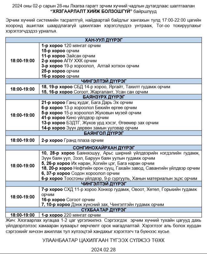 Өнөөдөр буюу 2024 оны 02-р сарын 28-ны Лхагва гарагт эрчим хүчний чадлын дутагдлаас шалтгаалан “ХЯЗГААРЛАЛТ ХИЙЖ БОЛЗОШГҮЙ” байршлуудыг танилцуулж байна.