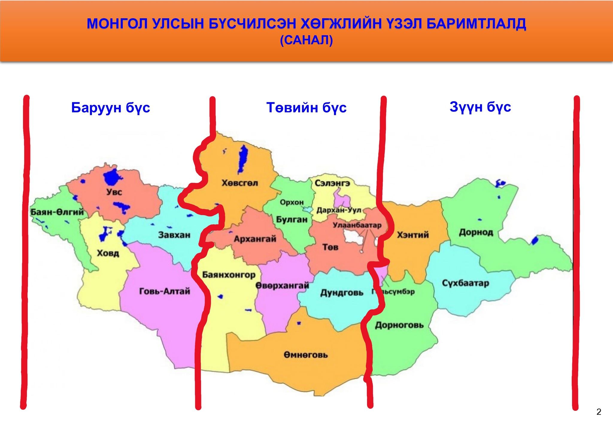 Энэ Форумд танилцуулсан Бүсчилсэн хөгжлийн үзэл баримтлалтай санал нийлэхгүй байгаа учраас би зөв зүйтэй гэж үзэж буй хувилбараа олон нийтэд танилцуулж эхлээд байна. Миний зүгээс Бүсчилсэн хөгжлийн бодлого бол улс орны хөгжлийн хэтийн төлвийн стратеги учраас зөвхөн өнөөдрийн байгаа боломж, нөөцдөө тулгуурлаж явцуу хүрээнд олон жижиг бүсэд хувааж төлөвлөх бус харин Монгол улсынхаа ирээдүйн хөгжлийг томоор харж дэлгэмэл байдлаар төлөвлөх нь зүйтэй гэж бодож байна. Зөвхөн өнөөдрийн байгаа нөөц, боломждоо тулгуурлан тодорхой хэдхэн бүс нутгийн онцлогт дулдуйдаж үе шаттай хөгжүүлнэ гэвэл ганц хоёр бүс нутаг бусдаасаа илүү хөгжих боломжтой болж тэр бүс нутагт хүн ам, хөрөнгө хүчний төвлөрөл үүсэж, бусад бүс нутаг эзгүйрэх, ажиллах хүчний хомсдолд орох, улмаар хөгжил нь саарах эрсдэл үүснэ! Тиймээс Монгол улсынхаа Бүсчилсэн хөгжлийн зураглалыг босоо тэнхлэгээр “Баруун бүс”, “Төвийн бүс”, “Зүүн бүс” гэсэн 3 тэнцүү бүсэд хувааж хэтийн төлөвдөө эн тэнцүү хөгжлийн боломжтой байхаар төлөвлөх нь зүйтэй гэж төсөөлж байна.