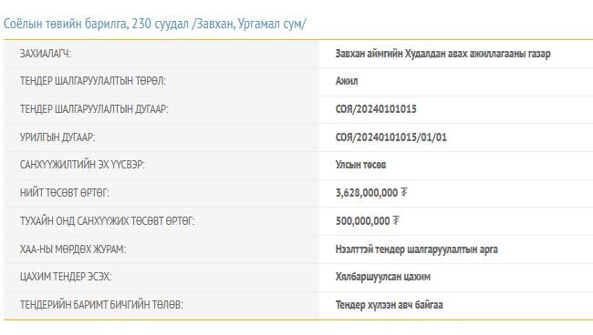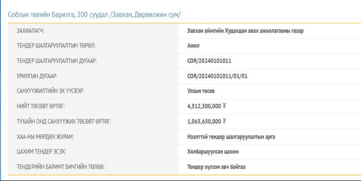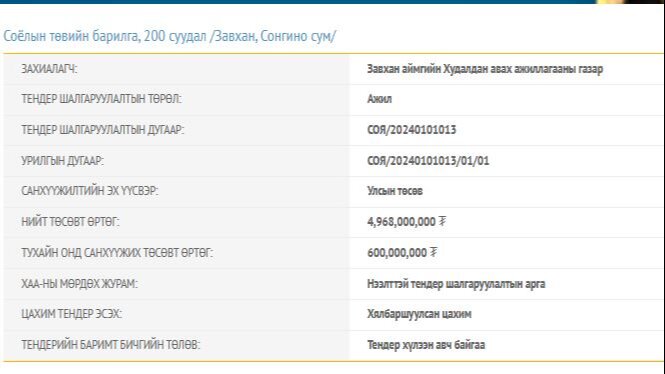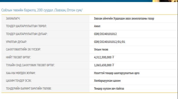Тендерийн баримт бичигт тусгаснаар Дөрвөлжин, Отгон сумын 200 суудалтай Соёлын төвийг 4.5 тэрбум төгрөгөөр барихаар төлөвлөсөн бөгөөд энэ онд НЭГ тэрбум төгрөгийн санхүүжилтийг хийх юм. Мөн Сонгино суманд 4.9 тэрбум төгрөгөөр Соёлын төв барихаар төлөвлөж энэ төсвийн жилд 600 сая төгрөгөөр санхүүжүүлэхээр болжээ.