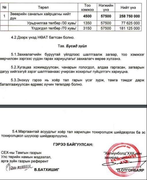 Харин гуравдугаар сард төрийн сангаас 155 сая төгрөгийн санхүүжилт авсан бол Аэймаркет ХХК руу тийзний үнэ 5.1 сая төгрөг, Халиунболд ХХК руу 77 сая төгрөг шилжүүлсэн талаараа таван сая төгрөгөөс дээш зарлагын хэсэгт мэдээллээ. Тэгвэл Халиунболд компани руу ямар учраас 77 сая төгрөг шилжүүлсэн талаарх мэдээллийг хавсралт хэсгээс тодруулахад тус компанитай СЕХ 258 сая төгрөгийн гэрээ хийсэн байна. Уг гэрээний дагуу Халиунболд компани 4500 ширхэг зөөврийн саналын хайрцгийг Сонгуулийн ерөнхий хороонд нийлүүлэх юм. Халиунболд компанийн хувьд нэг хайрцгийг 57500 төгрөгөөр нийлүүлэхээр гэрээлсэн байна. Тус компанийн хувьд барилгын засвар хийх, барьцаалан зээлдүүлэх үйлчилгээ, уул уурхайн чиглэлээр зөвлөгөө өгөх, авто машины худалдаа, гадаад худалдааны чиглэлээр үйл ажиллагаа явуулдаг байна.