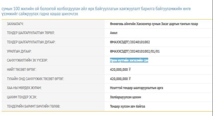 Тендерийн төсөвт өртөг 420 сая төгрөг бөгөөд Орон нутгийн хөгжлийн сангаас санхүүлэх юм. ОНХС-ийн зорилго нь орон нутгийн хөгжлийг дэмжих, бүс нутгийн хөгжлийн тэнцвэртэй байдлыг хангах, иргэд тогтвор суурьшилтай амьдрах орчин, нөхцөлийг бүрдүүлэхэд чиглэгддэг. Харин орон нутгийн удирдлагууд энэ хөрөнгийг ийнхүү хашаа ШИНЭЧЛЭН засварлах гэх мэт ажилд зарцуулсаар байна.