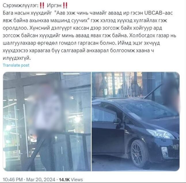 Цахим орчинд нийтлэгдсэн мэдээлэл болон иргэний дуудлага, мэдээллийн дагуу Баянзүрх дүүргийн цагдаагийн газрын хоёрдугаар хэлтсээс шалгалтын ажиллагаа явуулахад нэр бүхий такси үйлчилгээний жолооч Б нь иргэнээс ирүүлсэн дуудлагын дагуу хүүхэд тээвэрлэх гэж байхдаа өөр хүүхдийг андуурсан нөхцөл байдал урьдчилсан байдлаар тогтоогдож байна.