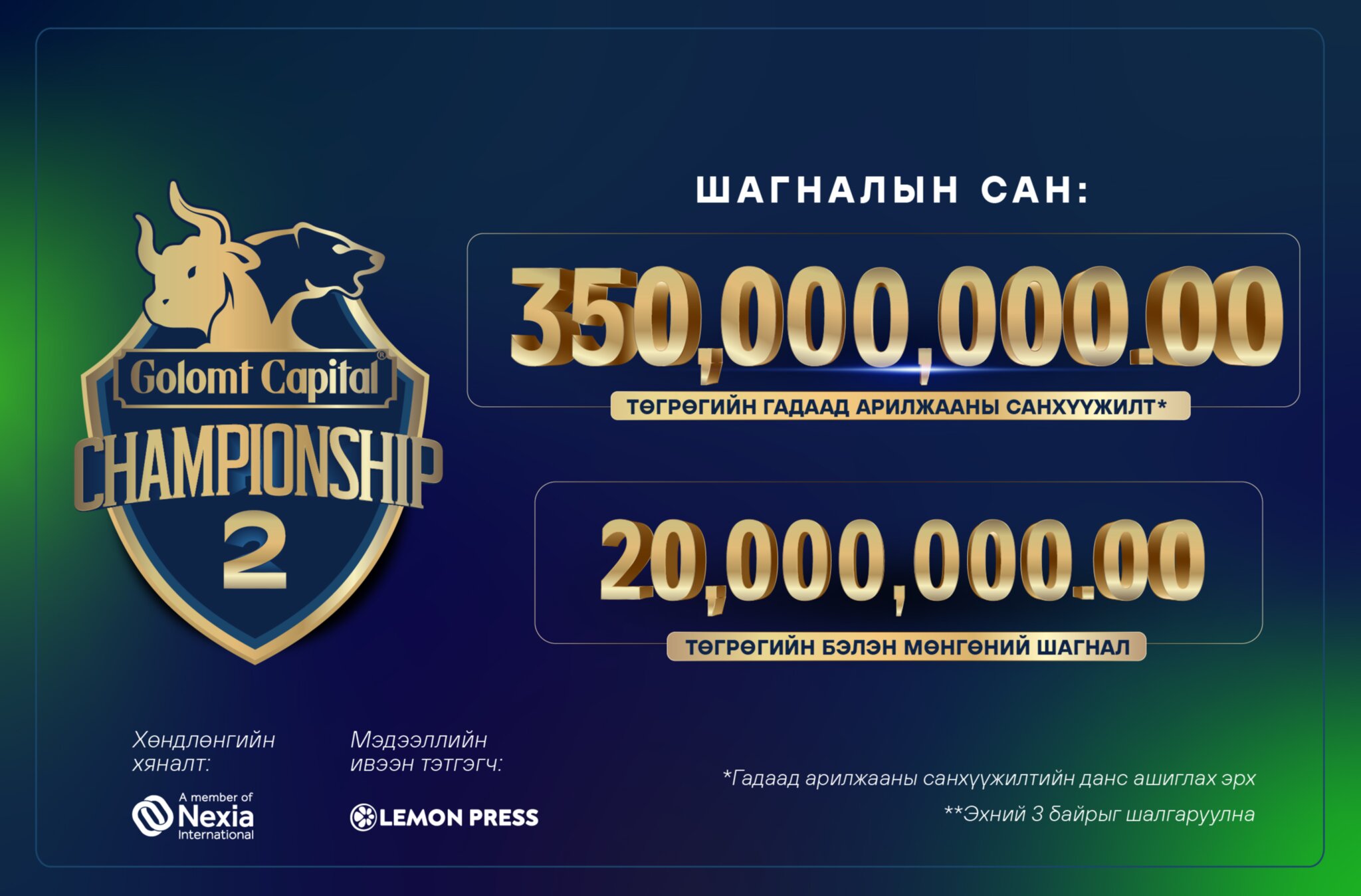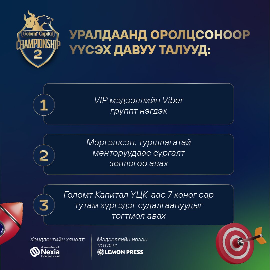 Тэгвэл энэ удаад зохион байгуулагдах “GОLOMT CAPITAL CHAMPIONSHIP-2”гадаад арилжааны уралдааны ялагчаар 3 хүн тодруулахаараа онцлогтой.