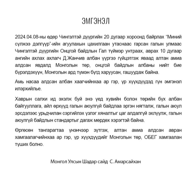 Тэрбээр "2024.04.08-ны өдөр Чингэлтэй дүүргийн 20 дугаар хороонд байрлах "Миний сүлжээ дэлгүүр"-ийн агуулахын цахилгаан утаснаас гарсан галын улмаас Чингэлтэй дүүргийн Онцгой байдлын Гал түймэр унтраах, аврах 10 дугаар ангийн ахлах ахлагч Д.Жанчив албан үүргээ гүйцэтгэж яваад алтан амиа алдсан явдалд Монголын төр, онцгой байдлын албаны нийт бие бүрэлдэхүүн, Монголын ард түмэн бүгд харуусан, гашуудаж байна. Амь насаа алдсан алба хаагчийн ар гэр, үр хүүхдүүдэд гүн эмгэнэл илэрхийлье. Өргөсөн тангарагтаа үнэнчээр зүтгэж алтан амиа алдсан авран хамгаалагчийнхаа ар гэр үр хүүхдүүдийг Монголын төр, ОБЕГ хамгаалан түших болно" гэжээ.