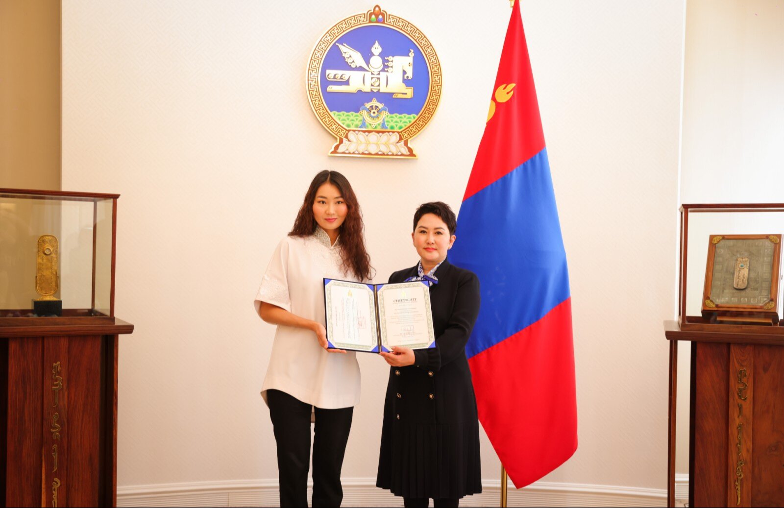 Гадаад харилцааны сайд Б.Батцэцэг Монгол Улсын Соёлын элчээр томилогдсон жүжигчин, продюсер А.Баярцэцэгийг хүлээн авч уулзан, Монгол Улсын Соёлын элчийн гэрчилгээг гардуулав.
