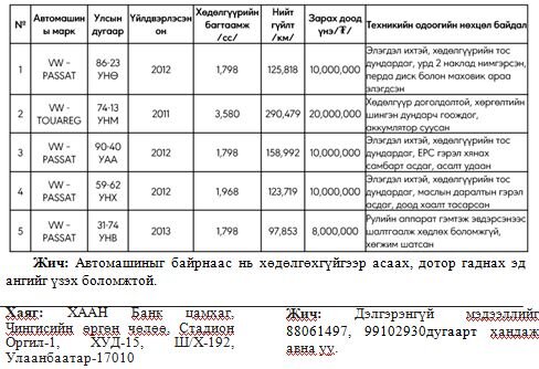 Үнийн санал өгөх заавар:“Үнийн санал ирүүлэх маягт”-ыг ХААН Банк цамхгийн ресепшинээс авч бөглөн дэнчин болох 250,000 төгрөг /нэг автомашинд нэг дэнчин байршуулна/-ийг 5000000015 тоот дансанд байршуулж мөнгө тушаасан баримтаа үнийн саналын маягтын хамт дугтуйнд хийж хүлээлгэн өгнө. Гүйлгээний утга дээр сонирхсон автомашины улсын дугаар болон өөрийн утасны дугаарыг бичнэ.