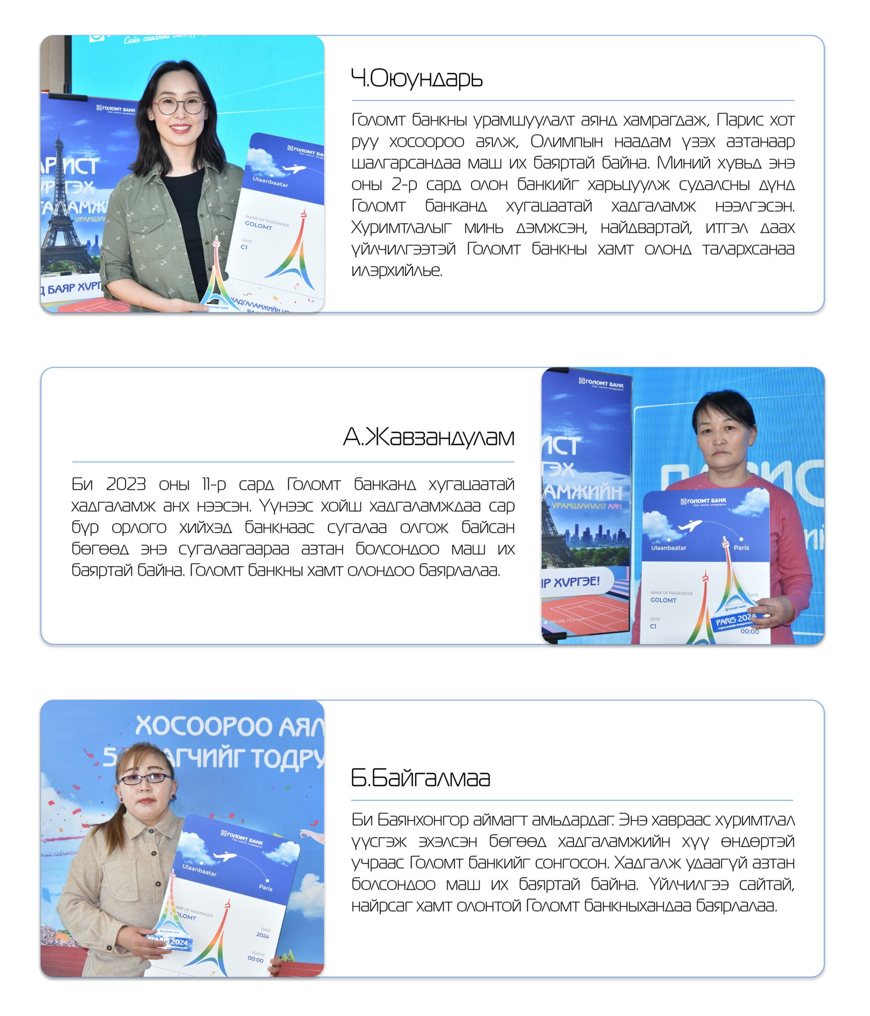 Голомт банкнаас үндэсний санхүүгийн дархлааг нэмэгдүүлж, иргэдийн хуримтлуулах зуршлыг дэмжих зорилготой “Парист хүргэх хадгаламж” урамшуулалт аяныг 2024.01.01-2024.04.15-ны хооронд зарлан амжилттай хэрэгжүүллээ. Урамшуулалт аяны хүрээнд Голомт банк хугацаатай, төгрөгийн хадгаламж шинээр нээсэн, орлого нэмсэн, хугацаа сунгасан харилцагчдадаа сугалаа олгож, үүссэн сугалаанаас Парис хот руу хосоороо аялах эрхийн 5 ялагчийгтодруулж, шагналыг гардуулан өглөө.