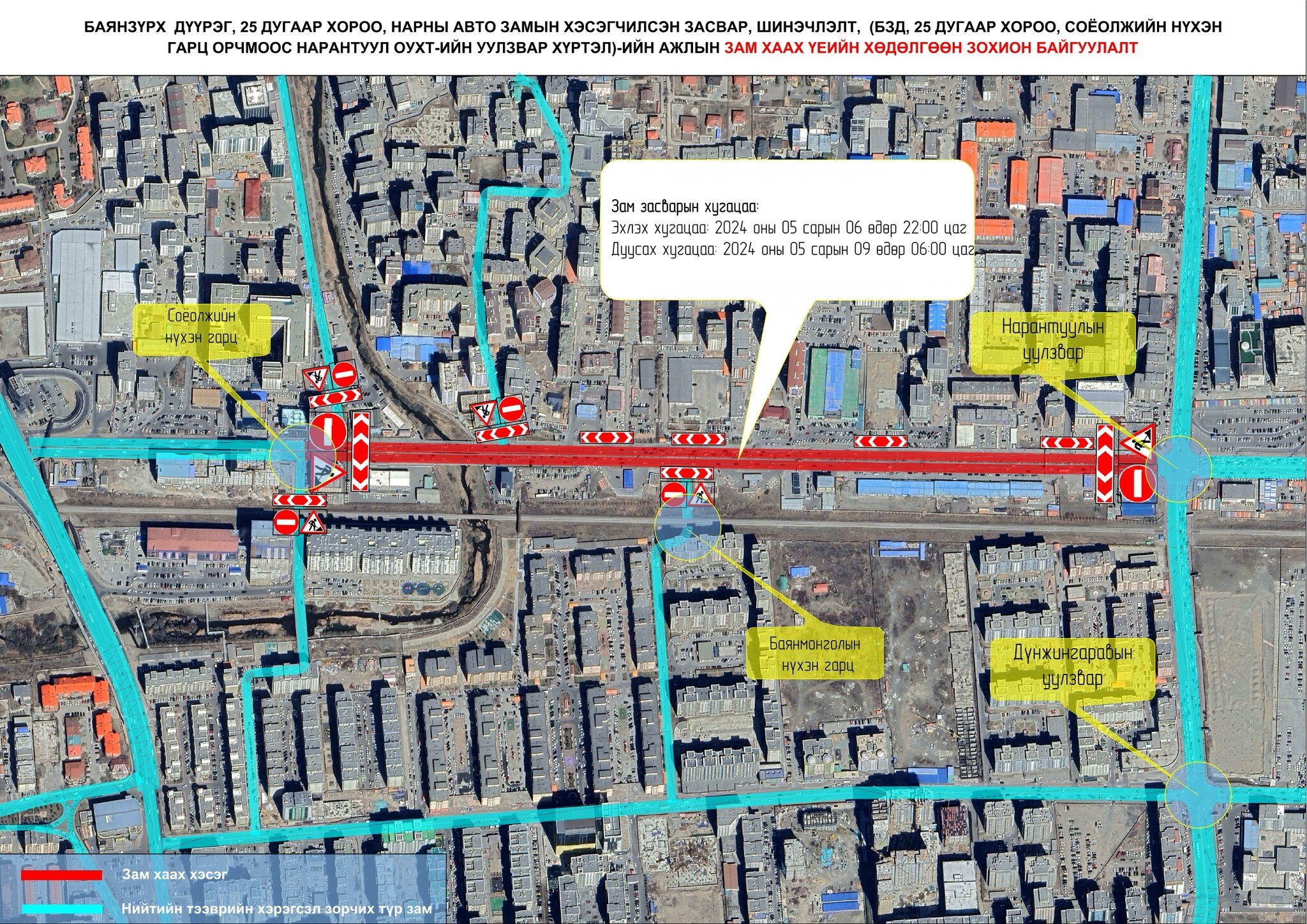 Баянзүрх дүүргийн 25 дугаар хорооны нутаг дэвсгэр, Соёолжийн нүхэн гарц орчмоос Нарантуул олон улсын худалдааны төвийн уулзвар хүртэлх авто замыг 2024 оны 05 сарын 06-ны өдрийн 22:00 цагаас 2024 оны 05 сарын 09-ний өдрийн 06:00 цагийн хооронд хааж, хэсэгчилсэн засварын ажил хийнэ.