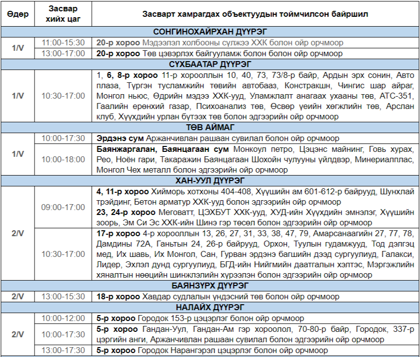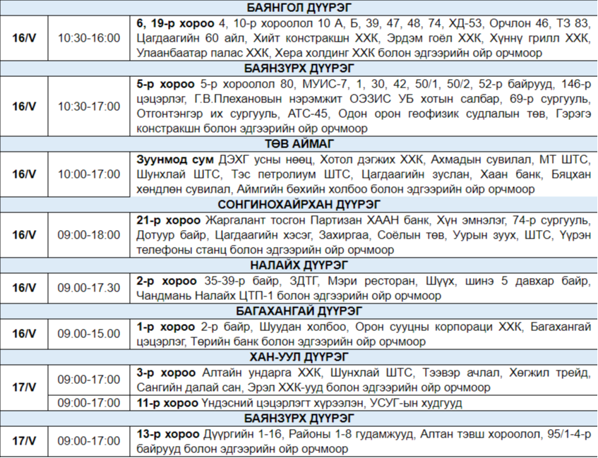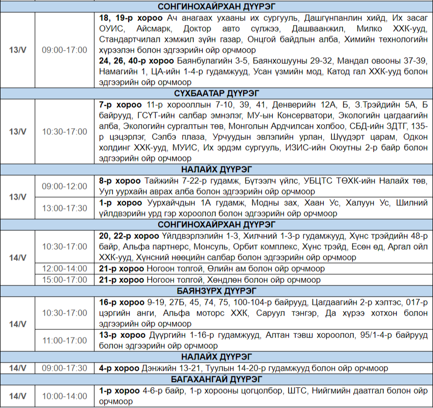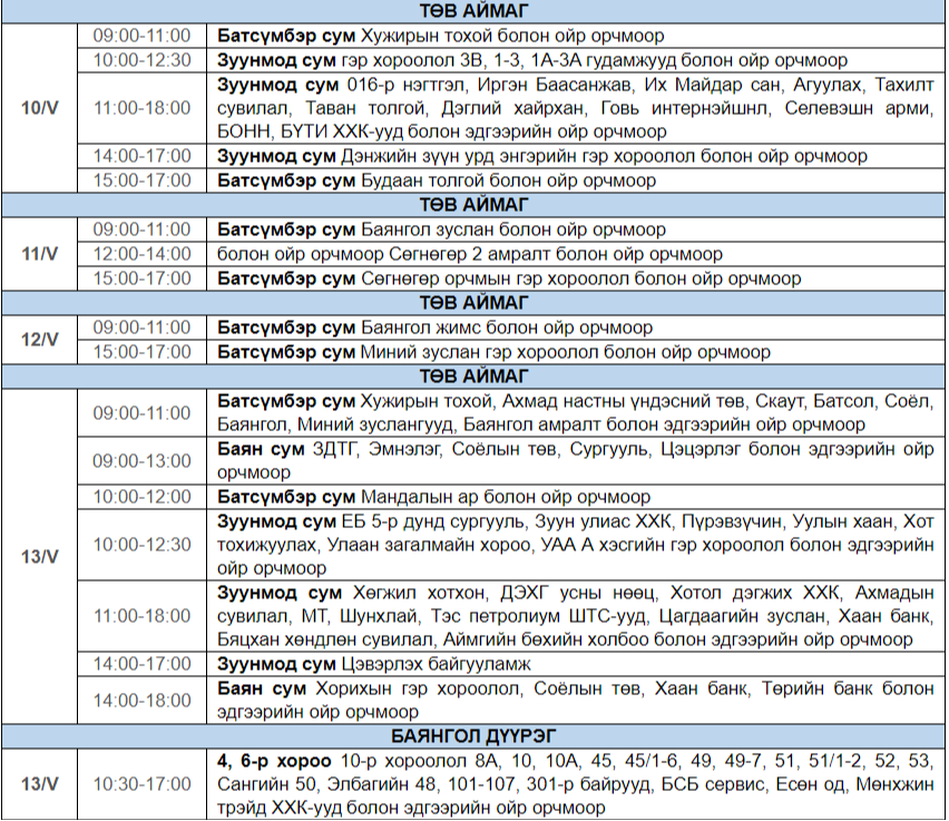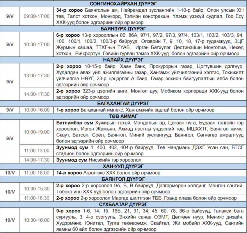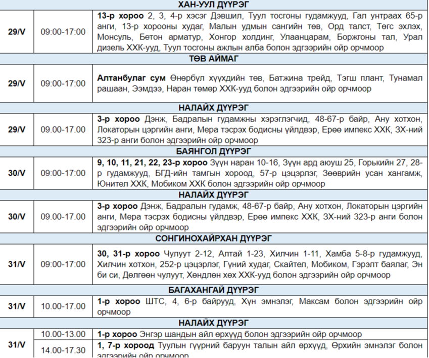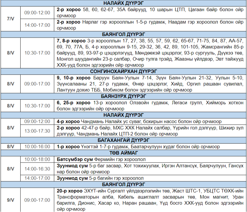 Цахилгааны шугам сүлжээ, тоноглолд засвар үйлчилгээ хийх тавдугаар сарын хуваарь гарлаа.