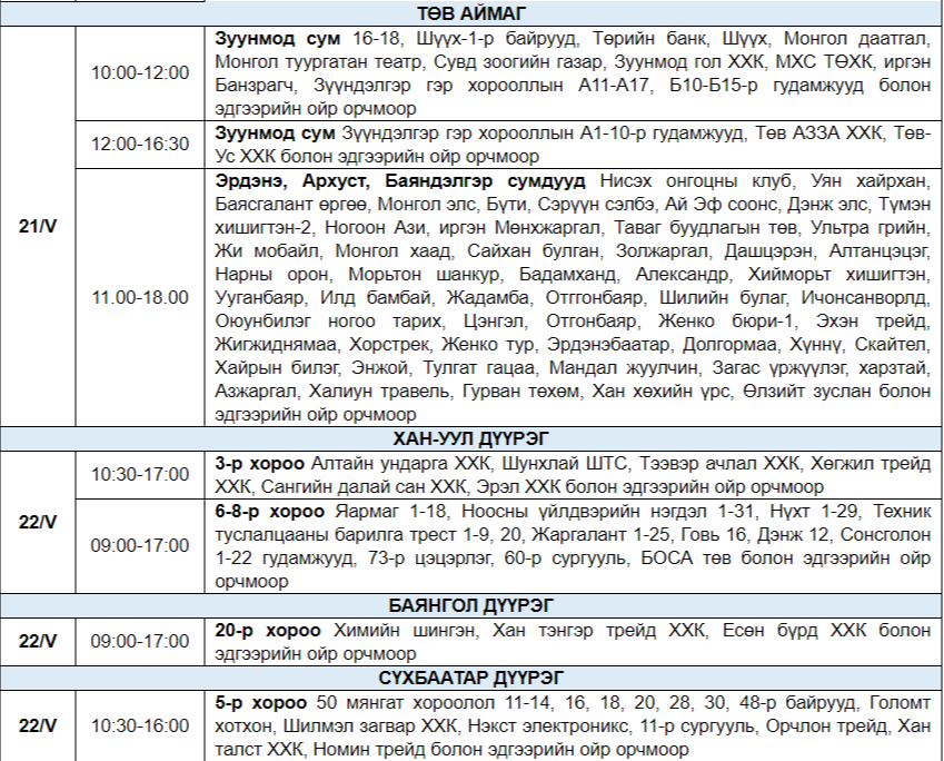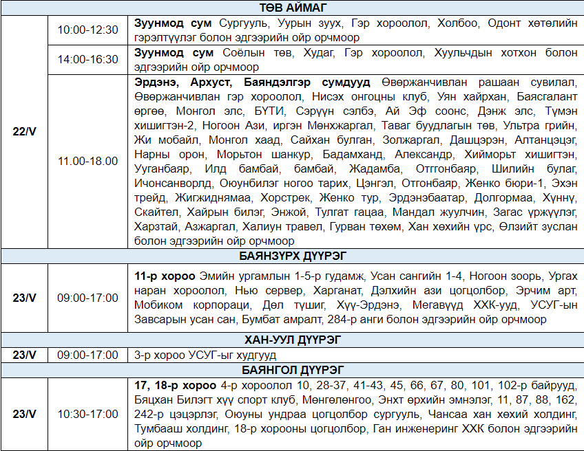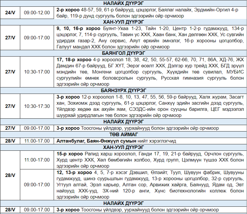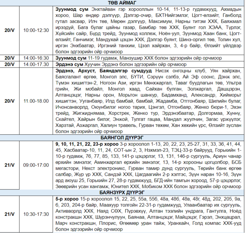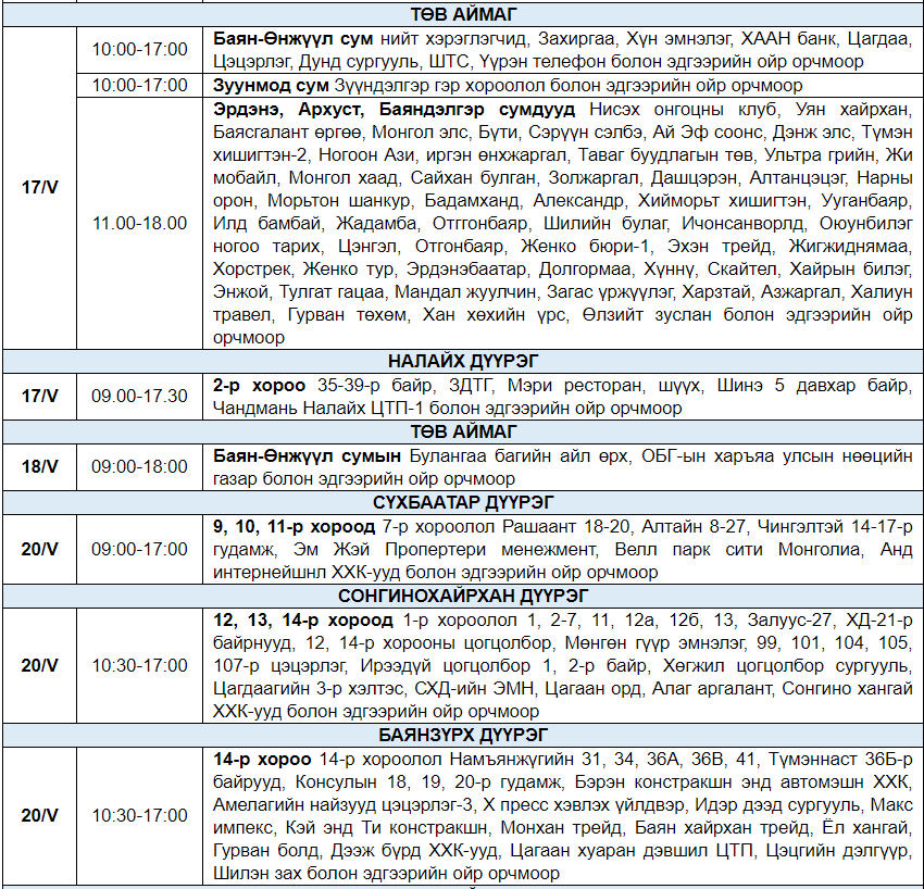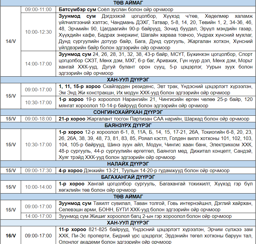 Цахилгааны шугам сүлжээ, тоноглолд засвар үйлчилгээ хийх тавдугаар сарын хуваарь гарлаа.
