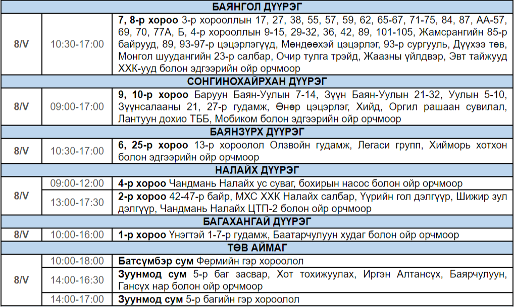 Эрчим хүчний шугам сүлжээнд засвар үйлчилгээ хийх хуваарийн дагуу өнөөдөр /2024.05.08/ дараах байршлуудад цахилгаан хязгаарлана.