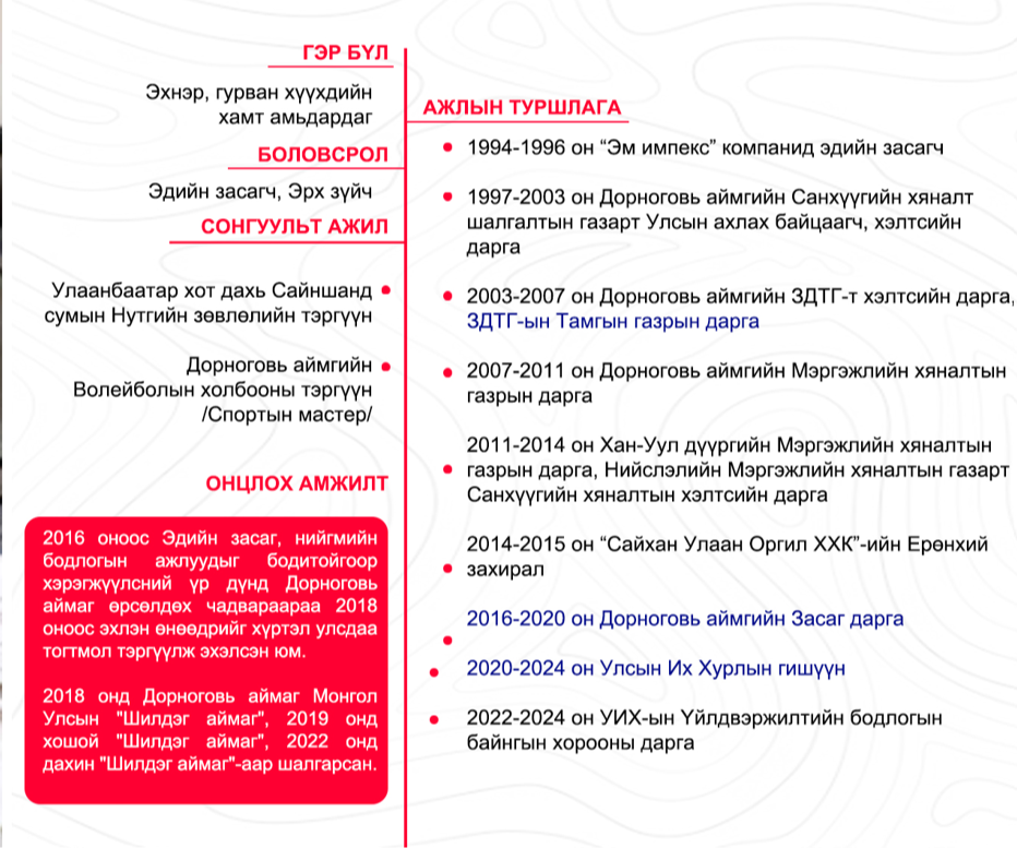 Аймгийн Засаг даргаас УИХ-ын гишүүн болсон цөөн гишүүдийн нэг бөгөөд УИХ-ын байнгын хороог даргалж байсан. УИХ-ын Үйлдвэржилтийн бодлогын байнгын хороог 2022-2024 онд тэргүүлж, Үйлдвэрлэл, технологийн паркийн эрх зүйн орчныг бүрдүүлсэн. Чуулганы нэгдсэн хуралдааны ирц хамгийн өндөр, хурлаа тасалдаггүй, хоцордоггүй гишүүдийн нэгээр тэрээр нэрлэгдээд байгаа. Түүний ажил, амьдралын намтартай танилцъя.