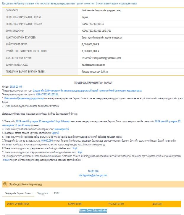 Тус газар нийт найман тэрбум төгрөгөөр автомашин худалдан авах юм. Гэвч энэхүү тендертэй холбоотой хэд хэдэн анхаарал татаж байгаа асуудал байна. Яг одоогоор www.tender.gov.mn-ээс тус тендерийн баримт бичиггүй. Нэг үгээр дээрх хөрөнгөөр Цагдаагийн байгууллагын үйл ажиллагаанд шаардлагатай тусгай тоноглол бүхий ямар автомашин хичнээн ширхэгийг худалдан авах эсэх талаар мэдээлэл тодорхойгүй байна.