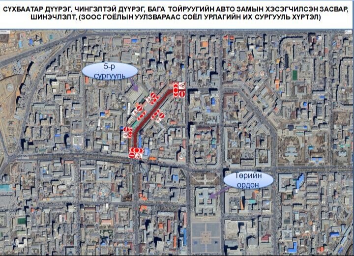 ”Зоос гоёл”-ын уулзвараас Соёл урлагийн их сургуулийн уулзвар хүртэлх замыг 2024 оны 05 сарын 15-ны өдрийн 23:00 цагаас 2024 оны 05 сарын 18-ны өдрийн 06:00 цагийн хооронд хааж авто замын засвар, шинэчлэлтийн ажлыг хийж гүйцэтгэнэ.