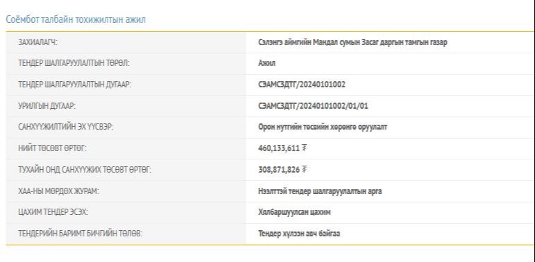 Сэлэнгэ аймгийн Мандал сумын Засаг даргын Тамгын газраас 460 сая төгрөг төсөвт өртөгтэй тендер зарласан байна. Үүнээс 2024 оны төсвийн жилд 308 сая төгрөгийн санхүүжилтийг олгохоор болсон байна.