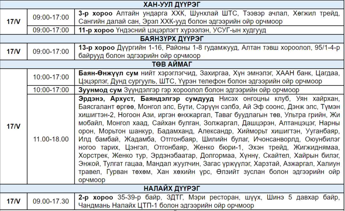 Эрчим хүчний шугам сүлжээнд засвар үйлчилгээ хийх хуваарийн дагуу өнөөдөр /2024.05.17/ дараах байршлуудад цахилгаан хязгаарлана.