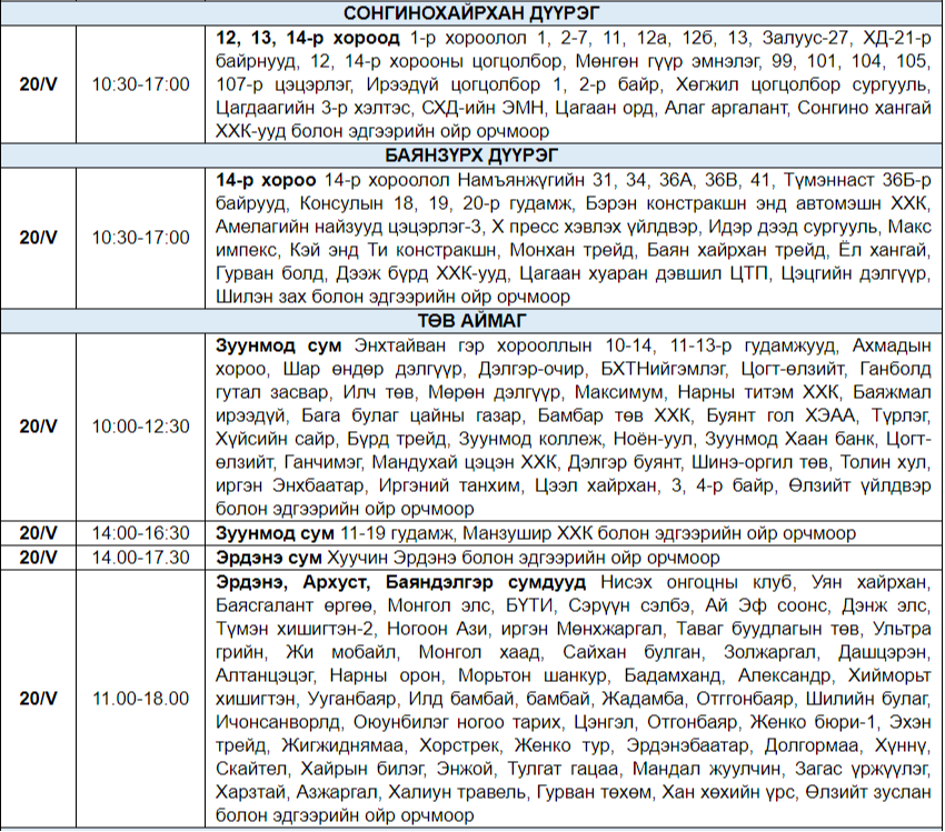 Эрчим хүчний шугам сүлжээнд засвар үйлчилгээ хийх хуваарийн дагуу өнөөдөр /2024.05.20/ дараах байршлуудад цахилгаан хязгаарлана.
