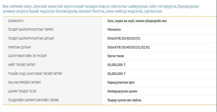 Хүнс хөдөө аж ахуй хөнгөн үйлдвэрийн яамнаас бүх нийтийн хоол, хүнсний зохистой хэрэглээний талаарх мэдлэг, ойлголтыг сайжруулах, соён гэгээрүүлэх, боловсролыг дэмжих агуулга бүхий мэдээлэл боловсруулж, контент бэлтгэх, олон нийтэд мэдээлэх, сурталчлахаар ТЕНДЕР зарласан байна.
