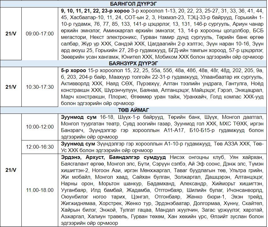 Эрчим хүчний шугам сүлжээнд засвар үйлчилгээ хийх хуваарийн дагуу өнөөдөр /2024.05.21/ дараах байршлуудад цахилгаан хязгаарлана.