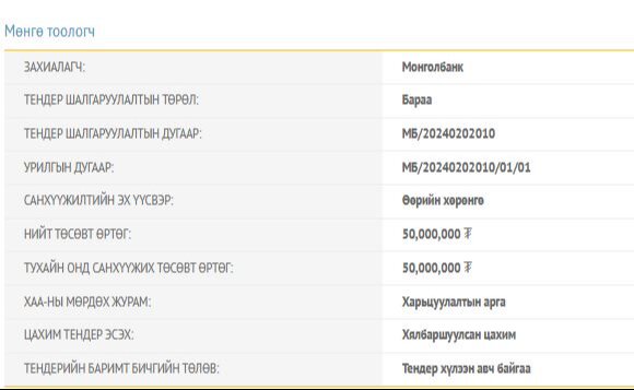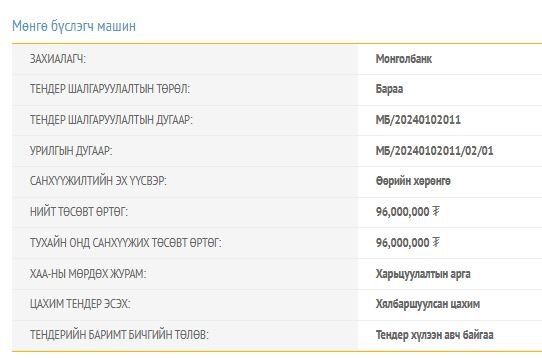 Төв банкнаас хоёр төрлийн тендер зарласан байна. Тодруулбал, Монголбанк 50 сая төгрөгөөр мөнгө тоологч машин, мөнгө бүслэгч машин 96 сая төгрөгөөр худалдан авахаар тендер зарлажээ.