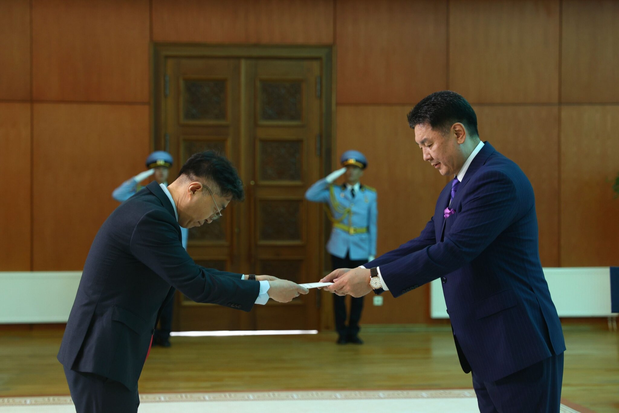 Монгол Улсын Ерөнхийлөгч Ухнаагийн Хүрэлсүхэд БНСУ-аас Монгол Улсад суух Онц бөгөөд Бүрэн эрхт Элчин сайд Чой Жин Вон Итгэмжлэх жуух бичгээ өргөн барилаа.