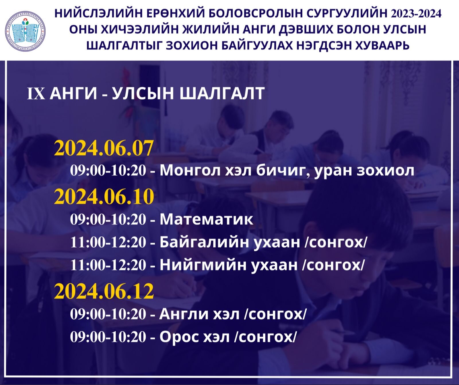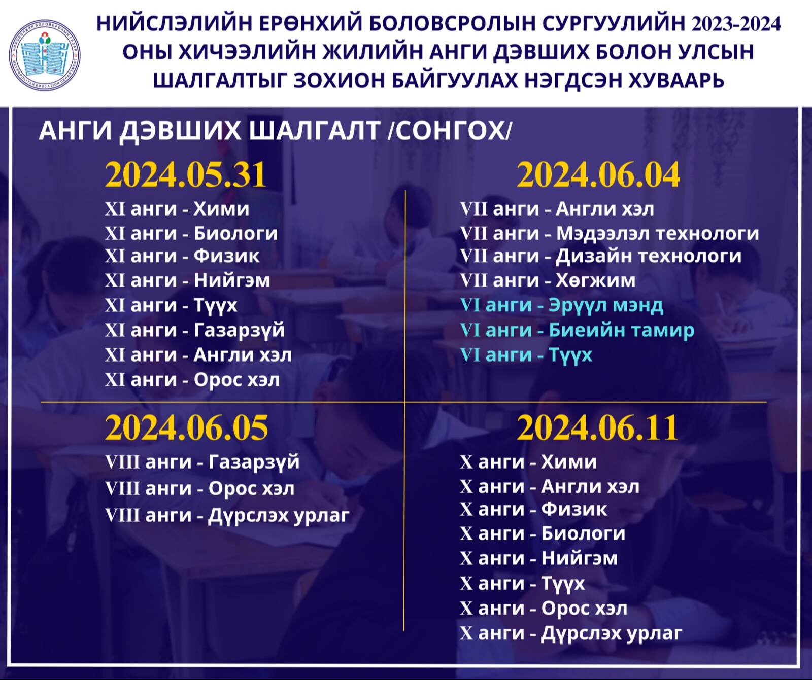 Нийслэлийн Боловсролын газраас нийслэлийн ЕБС-ийн 2023-2024 оны хичээлийн жилийн анги дэвших болон улсын шалгалтыг зохион байгуулах нэгдсэн хуваарийг нийтэд мэдээллээ.