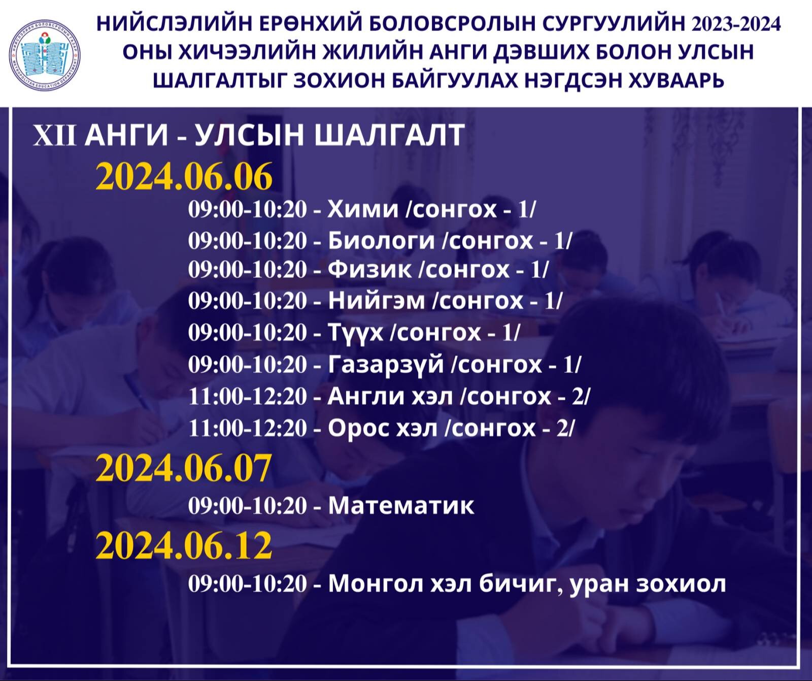 Сурагчдын улсын шалгалтын хуваарь гарчээ