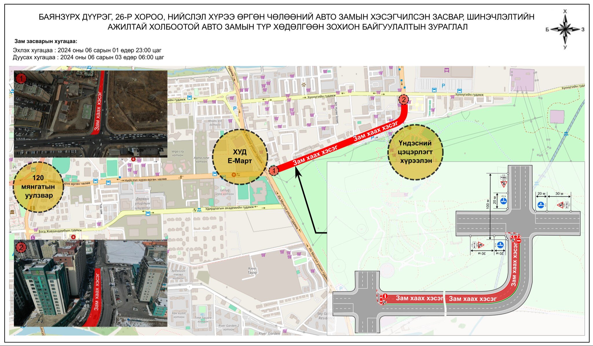 Баянзүрх дүүргийн 26 дугаар хорооны нутаг дэвсгэр, Нийслэл хүрээ өргөн чөлөөний замыг хэсэгчилсэн хааж, засвар хийнэ.