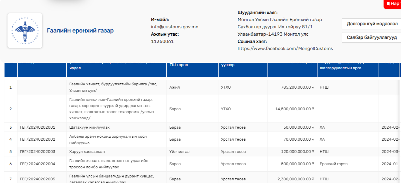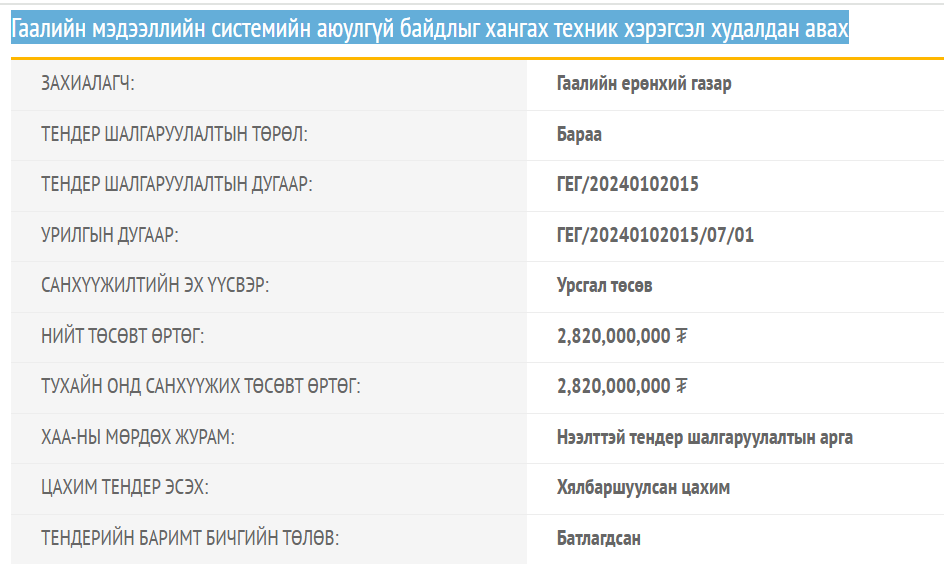 Гаалийн ерөнхий газраас улсын хэмжээнд гаалийн мэдээллийн системийн аюулгүй байдлыг хангах техник хэрэгсэл худалдан авахаар тендер зарласан байна.