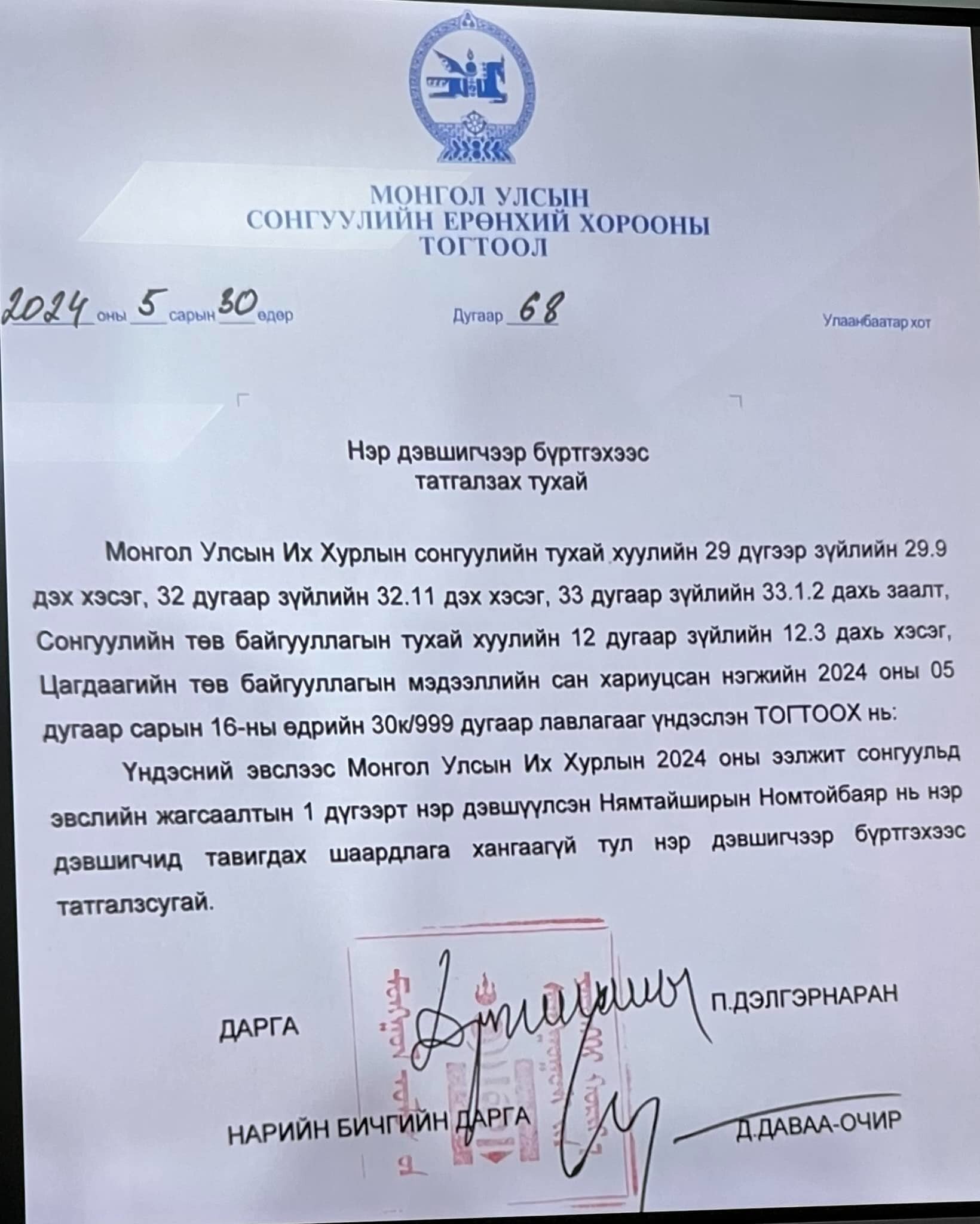 Н.Номтойбаярыг нэр дэвшигчээр БҮРТГЭХЭЭС ТАТГАЛЗЛАА