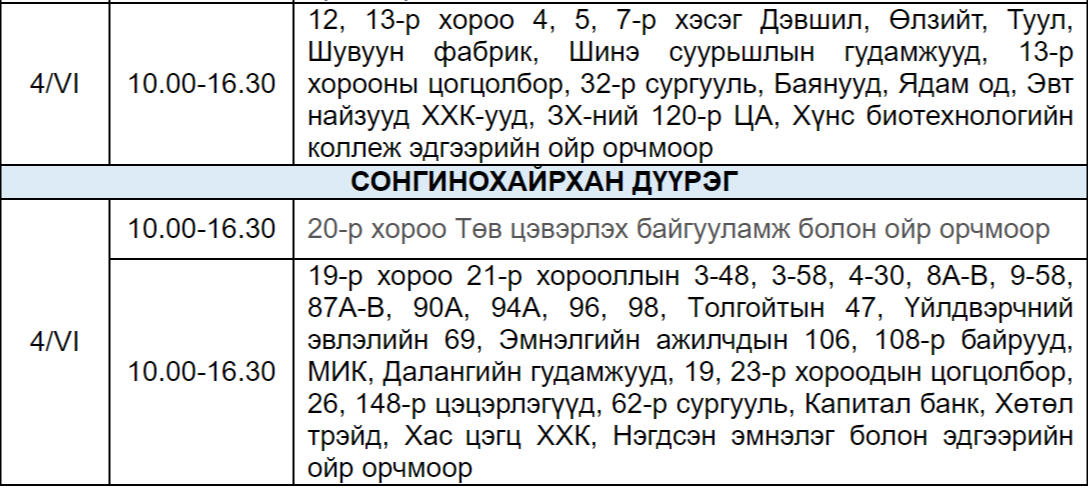 Эрчим хүчний шугам сүлжээнд засвар үйлчилгээ хийх хуваарийн дагуу өнөөдөр /2024.06.04/ дараах байршлуудад цахилгаан хязгаарлана.