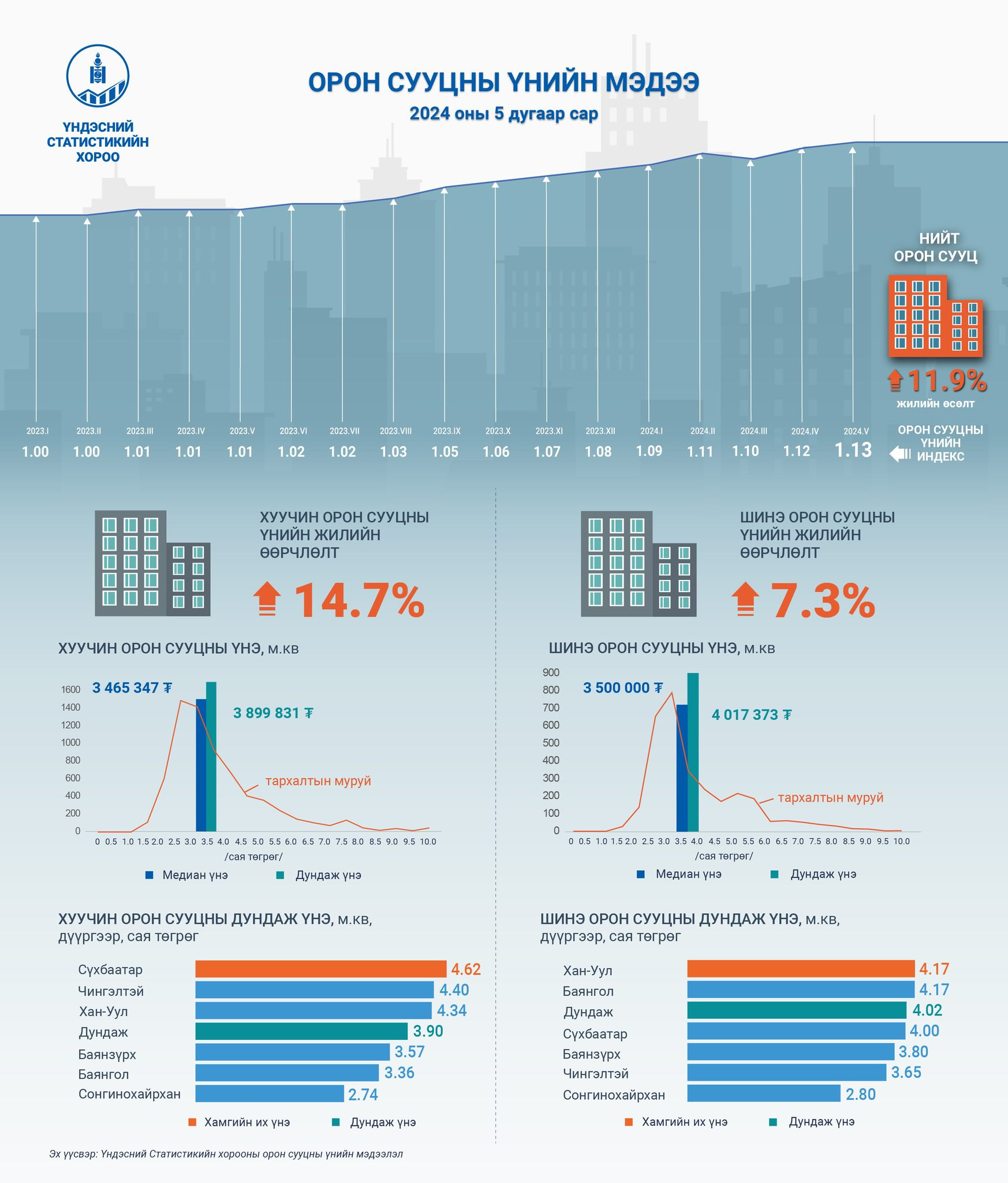 Хуучин орон сууцны 1 метр квадрат талбайн дундаж үнэ 3.90 сая төгрөг болж, Сүхбаатар дүүрэгт хамгийн өндөр буюу 4.62 сая төгрөгийн үнэтэй байна