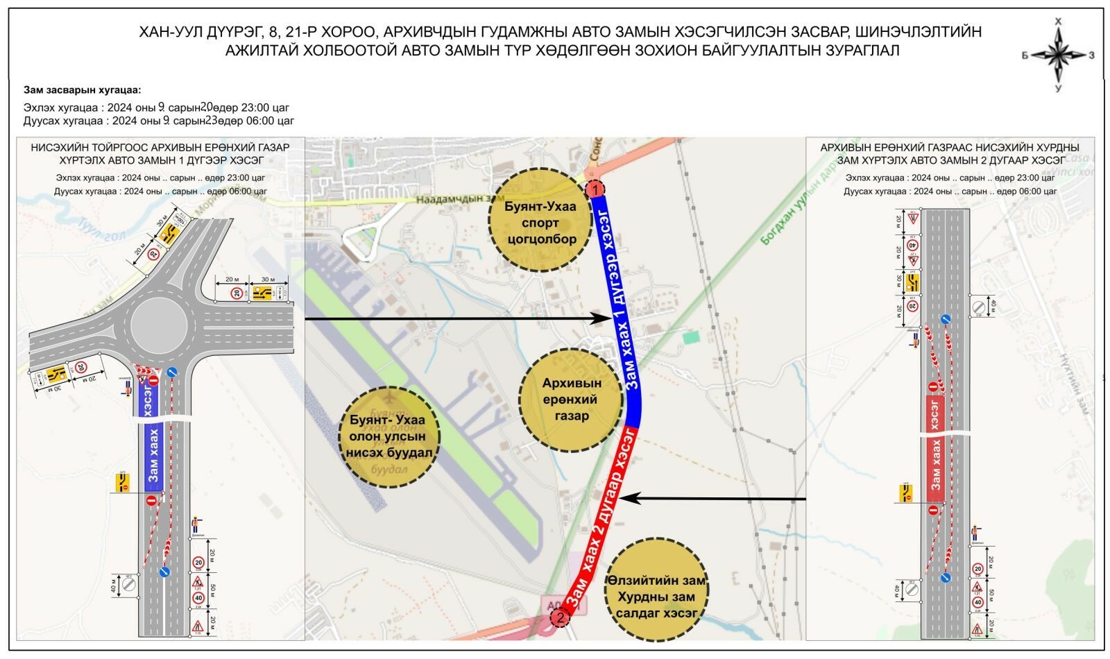 -Чингэлтэйн өргөн чөлөөний авто зам буюу Дамбын постын уулзвараас Долоон буудлын уулзвар хүртэлх авто замыг есдүгээр сарын 24-ний 23:00-26-ны 06:00 23-ны 06:00 цаг, Зүүн хэсгийн авто замыг есдүгээр сарын 26-ны 23:00-27-ны 06:00 цагийн хооронд хэсэгчлэн хааж, засварлана.
