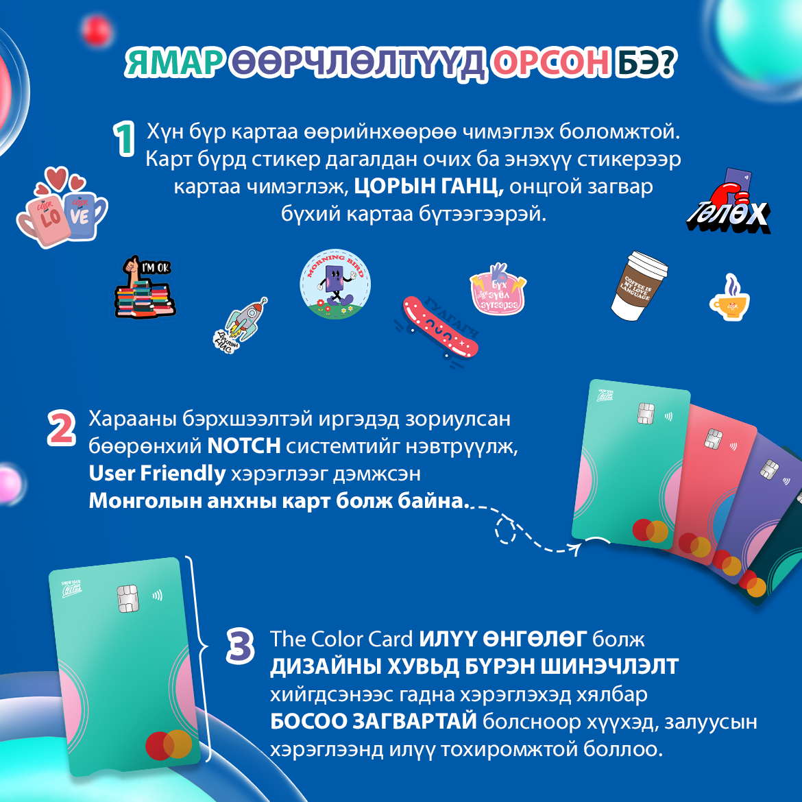 Харин та хараахан The Color Card-ын хэрэглэгч болж амжаагүй бол дараах сувгуудын аль нэгийг ашиглан картаа захиалан авах боломжтой.