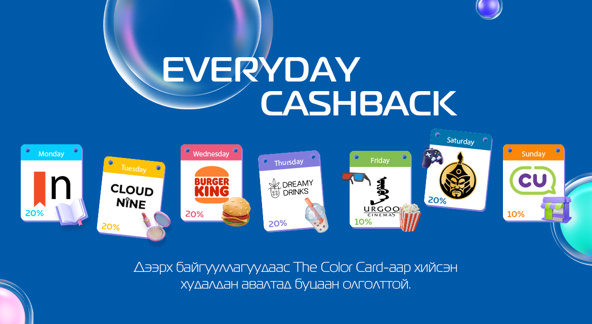 The Color Card хуучин харилцагчдаа ч мөн марталгүй буцаан олголтоор урамшуулж байна. Картын шинэ болон хуучин харилцагчид 7 хоногийн гараг бүр 7 өөр байгууллагаас 10%-20%-ийн CASHBACK авах боломжтой.