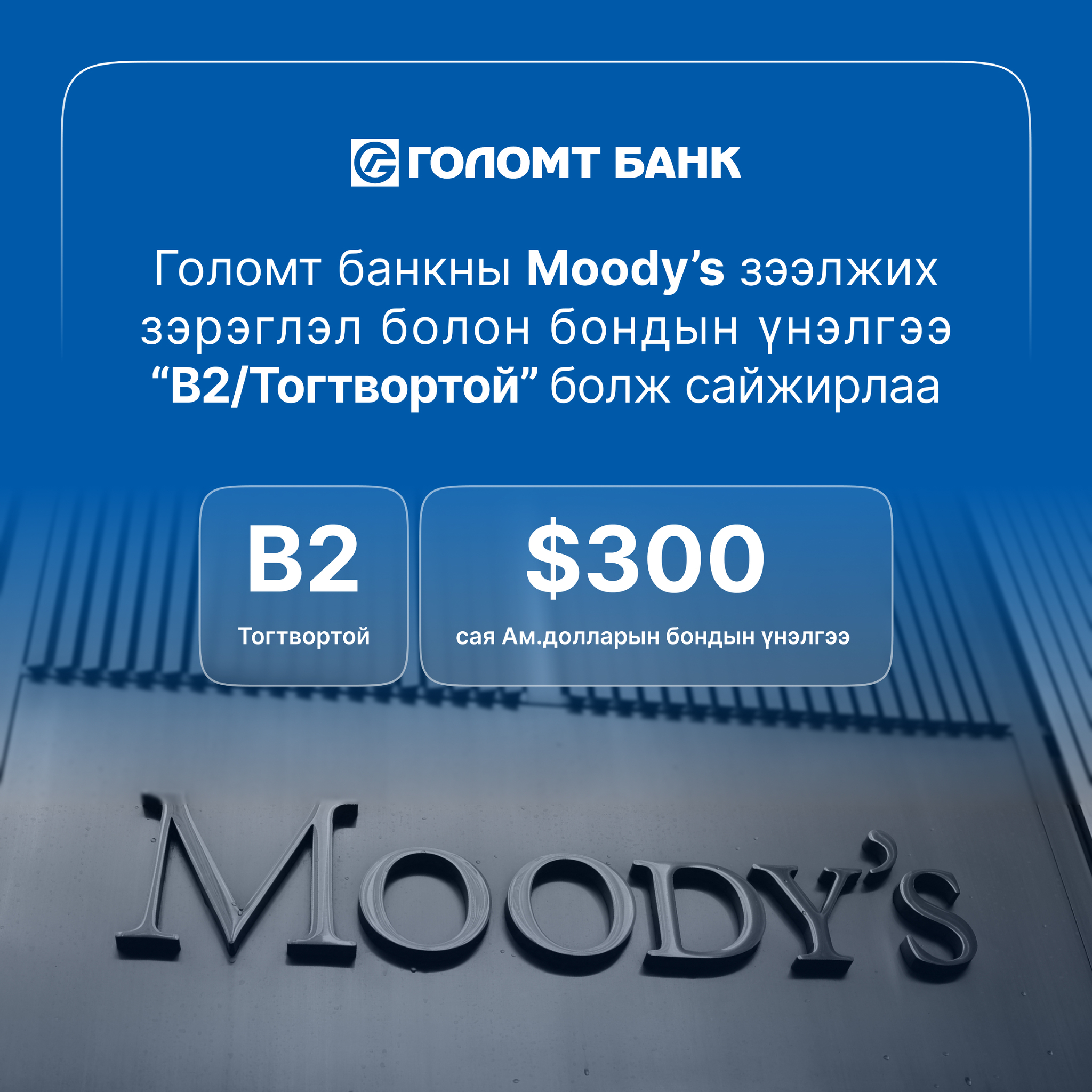 Moody’s Ratings (Moody’s) үнэлгээний агентлаг 2024 оны 11-р сарын 19-ний өдөр Голомт банкны зээлжих зэрэглэл болон 300 сая ам.долларын бондын үнэлгээг “B2” болгон өсгөж, “тогтвортой” төлөвтэй хэмээн үнэллээ. Ийнхүү үнэлгээ сайжирч байгаа нь Голомт банкны үйл ажиллагаа, санхүүгийн үзүүлэлтүүд сүүлийн жилүүдэд тогтмол өсөлттэй байгаа болон Монгол Улсын Засгийн газрын зээлжих зэрэглэлийн үнэлгээ өссөнтэй холбоотой.