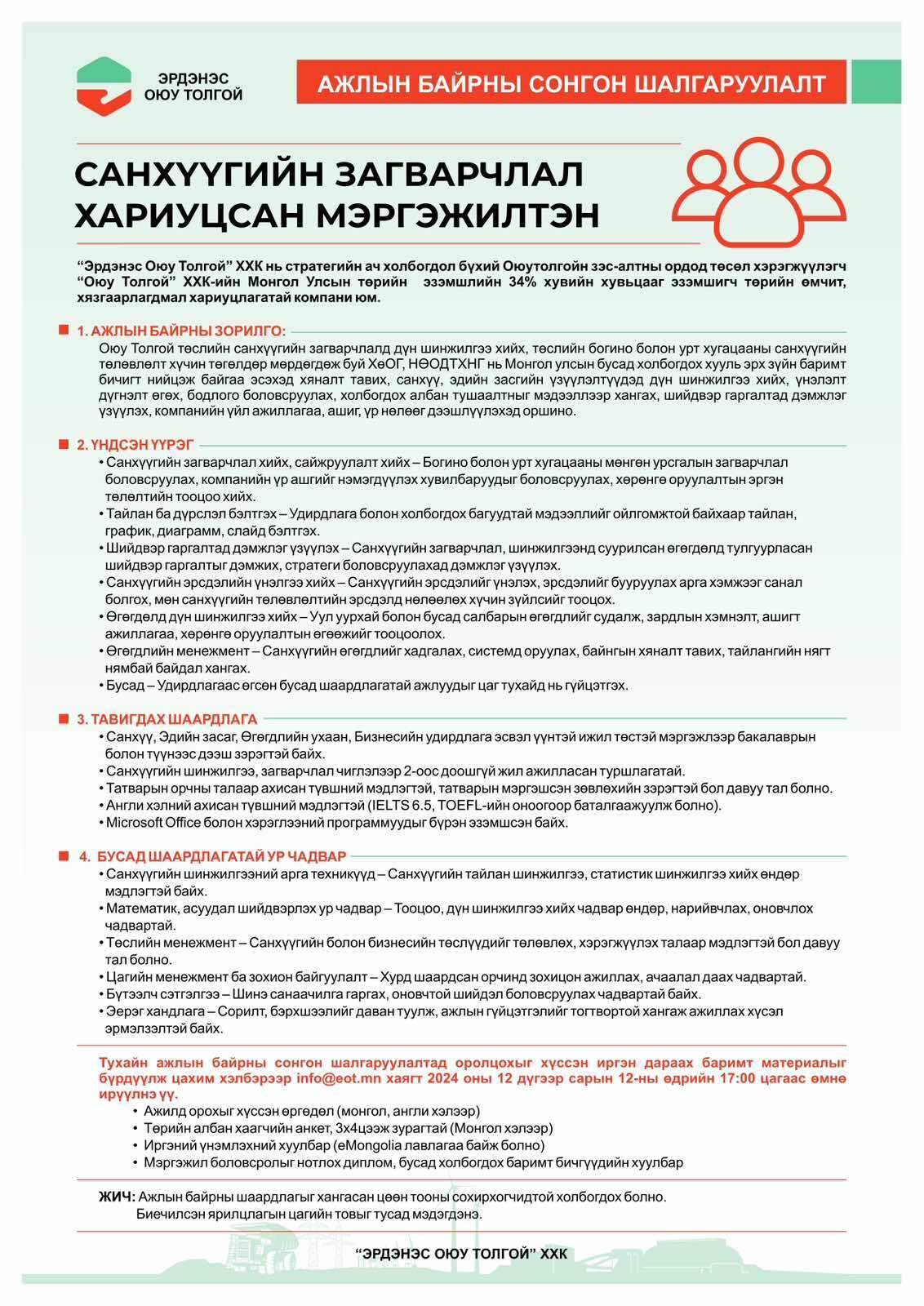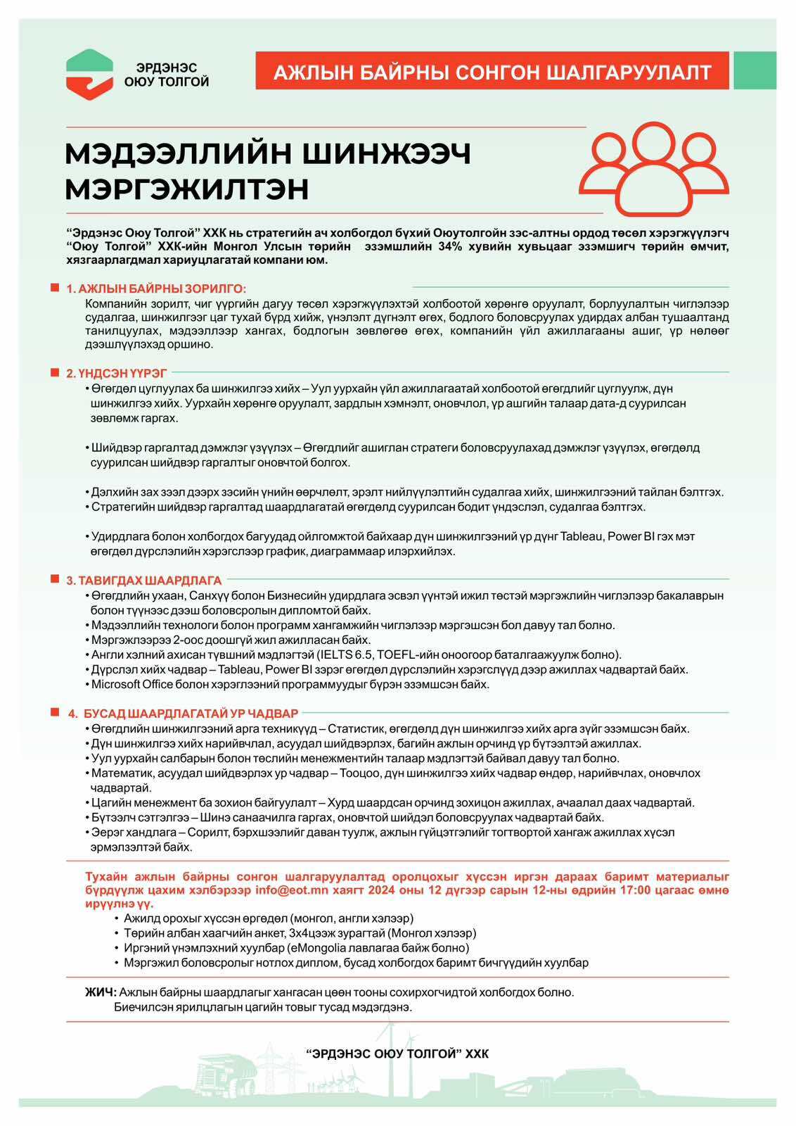 “Эрдэнэс Оюу Толгой” ХХК Ажлын байрны нээлттэй сонгон шалгаруулалт зарлалаа.