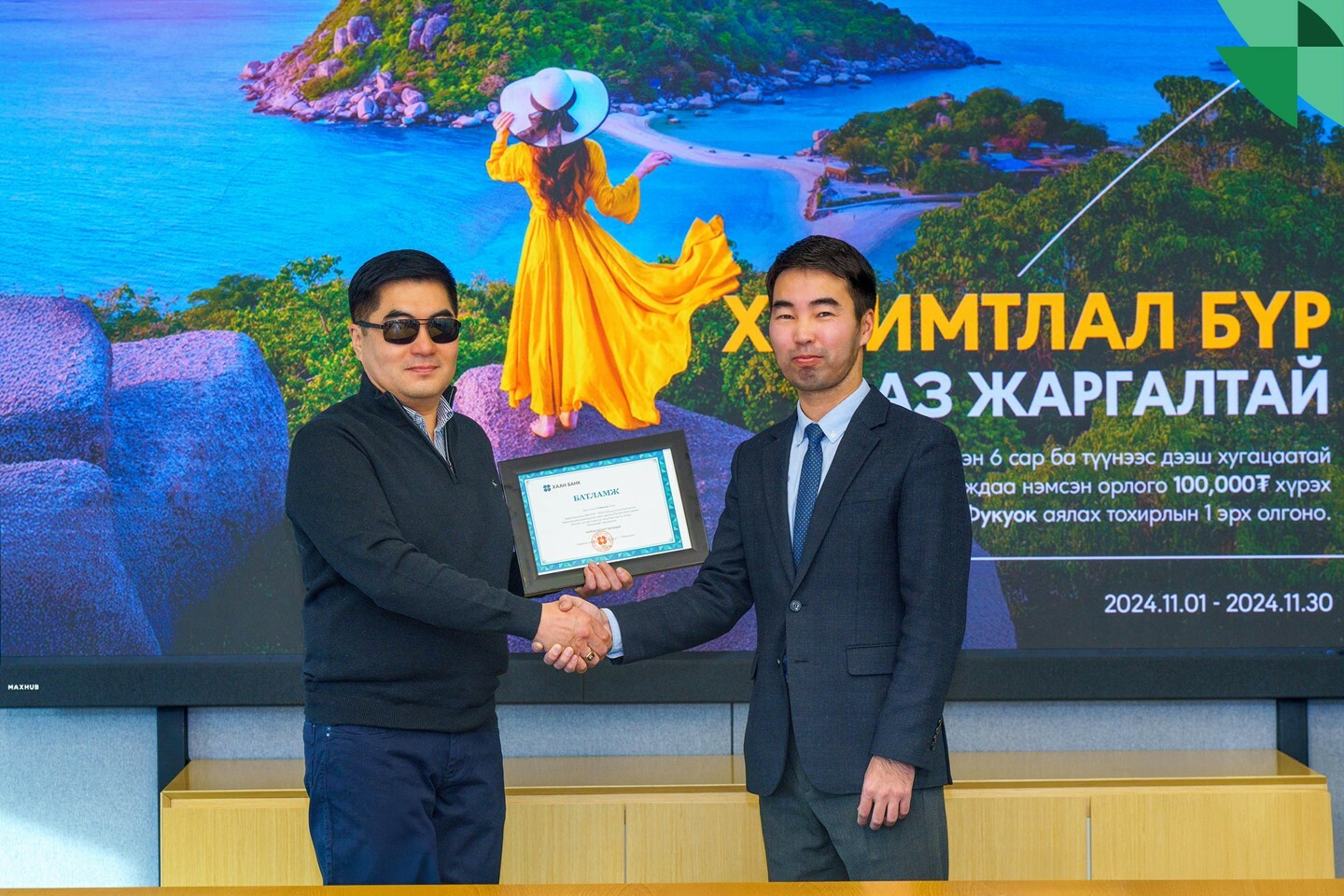 Мөн ХААН Банк харилцагчдадаа зориулан үзэсгэлэнт Фукуок арал руу аялах эрхийн урамшуулалтай хадгаламжийн аяныг зарласан билээ. Энэ хүрээнд 2024 оны 11-р сарын 1-30-ны өдрийг дуустал 6 сараас дээш хугацаатай төгрөгийн хадгаламж нээсэн болон хадгаламжийн дансандаа 100,000 төгрөг болон түүнээс дээш дүнтэй орлого хийсэн нийт харилцагчдаас 1 харилцагчийг тодруулж, батламж гардууллаа. Тус урамшууллын эзэн болсон харилцагч мөн адил нислэгийн тийз, зочид буудлын төлбөр болон бусад зардал багтсан цогц эрхийн эзэн болж буй.