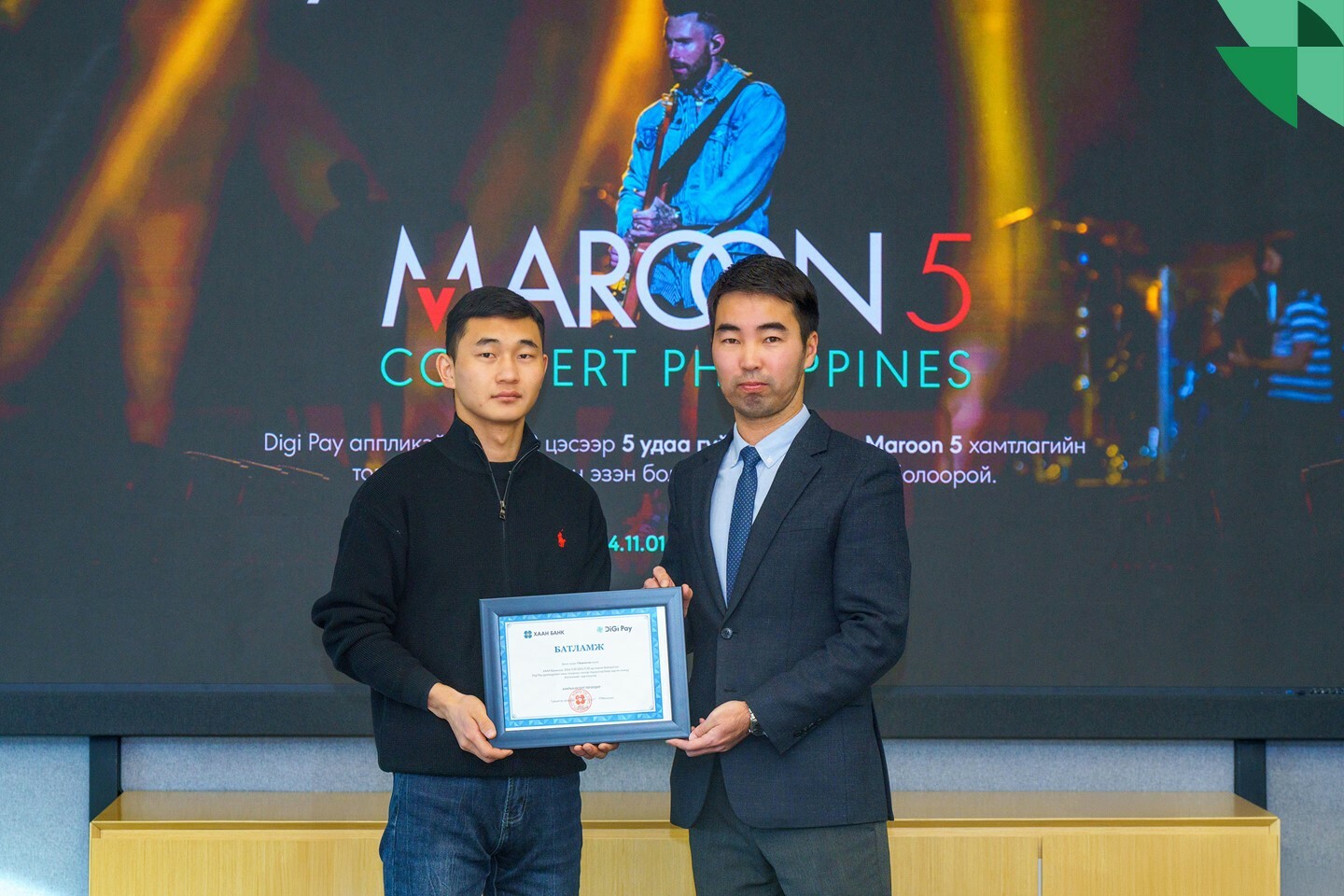 Digi Pay аппликэйшний урамшуулалт аяны хүрээнд хоёр харилцагчийг тодруулан өнөөдөр батламж гардууллаа. Эдгээр харилцагчид 2025 оны 1-р сард Филиппин улсын Манила хотод болох дэлхийн алдарт Maroon 5 хамтлагийн тоглолт үзэхээс гадна нислэгийн тийз, зочид буудлын төлбөр болон Манила хотын аялал багтсан цогц эрхийн эзэд болж байна.