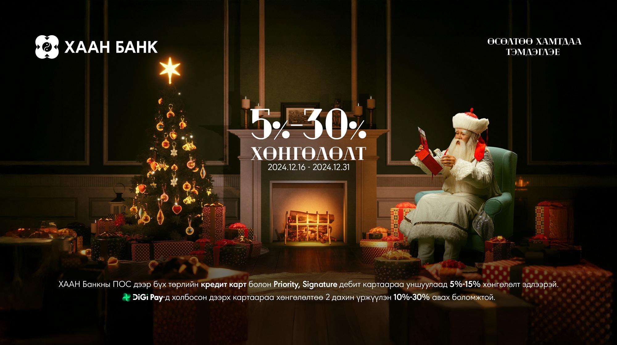 Хэрвээ та Priority, Signature дебит карт болон бүх төрлийн кредит карттай бол 2024 оны 12-р сарын 16-наас 12-р сарын 31-ний өдрийг дуустал дараах сонгогдсон байгууллагуудаар үйлчлүүлэхдээ 30 хүртэлх хувийн хөнгөлөлт эдлэх боломжтой. Тухайлбал, та картаа ХААН Банкны ПОС төхөөрөмжид шууд уншуулснаар 5-15 хувийн хөнгөлөлт, харин картаа Digi Pay аппликэйшнд холбон төлбөрөө төлснөөр 10- 30 хувийн хөнгөлөлт авах боломжтой юм. Та ЭНД дарж сонгогдсон байгууллагуудын дэлгэрэнгүй мэдээлэлтэй танилцана уу.