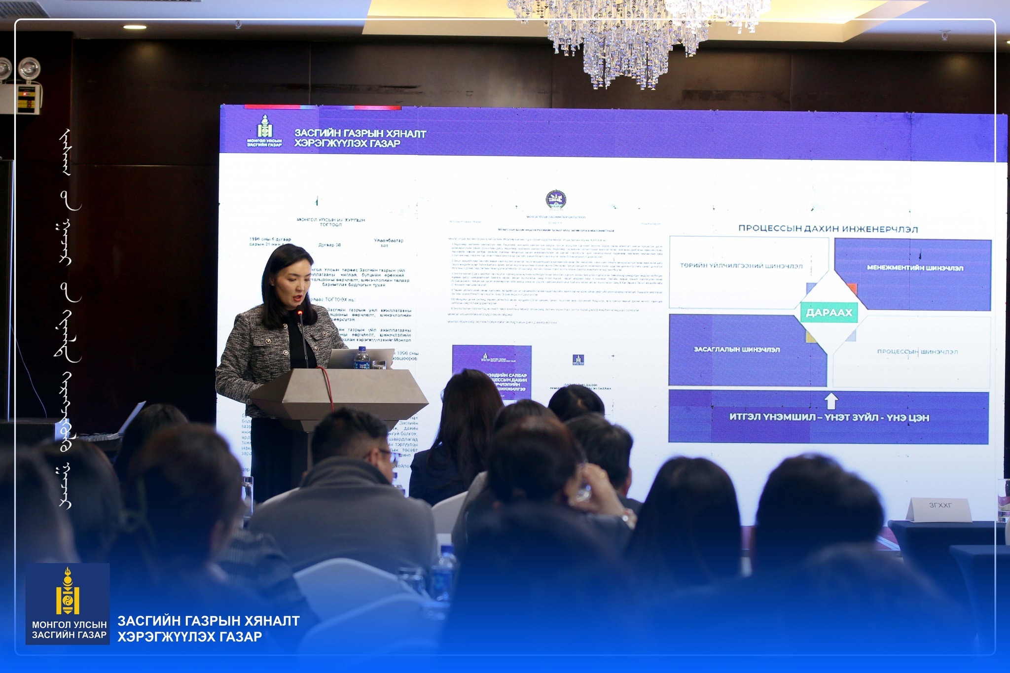 Тэрээр, Төрийн бүтээмж, процессын дахин инженерчлэлийн тухай танилцуулж, Процессын дахин инженерчлэл бол төрийн бүтээмжийг дээшлүүлэх тактикийн арга хэрэгсэл гэдгийг тэмдэглэв. ПДИ нь манай улсад сүүлийн жилүүдэд гарч ирсэн ойлголт биш бөгөөд төрийн зардлыг бууруулах, үр дүнг дээшлүүлэх зорилгоор 1998 онд Засгийн газрын тогтоол гарч байсан. Өдгөө Засгийн газрын 2023 оны тогтоолоор Эрүүл мэндийн яам, Хөдөлмөр нийгмийн хамгааллын салбар, Байгаль орчин, уур амьсгалын өөрчлөлтийн яам, Ойн газарт процессын дахин инженерчлэл хийх тогтоол гарч, ЗГХХГ чиг үүргийн дагуу ажиллаж тодорхой үр дүнд суурилсан зөвлөмжүүдийг гаргаж байгаа тухай дэлгэрэнгүй танилцуулав.