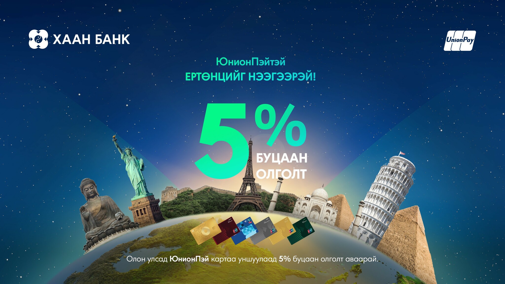 "ЮнионПэйтэй ертөнцийг нээгээрэй" урамшуулалт аян нь ХААН Банкны харилцагчдад олон улсын худалдан авалтыг илүү ойртуулж, санхүүгээ хэмнэх боломжийг санал болгож байна. ХААН Банктай хамт илүү олон боломжийг нээцгээе!