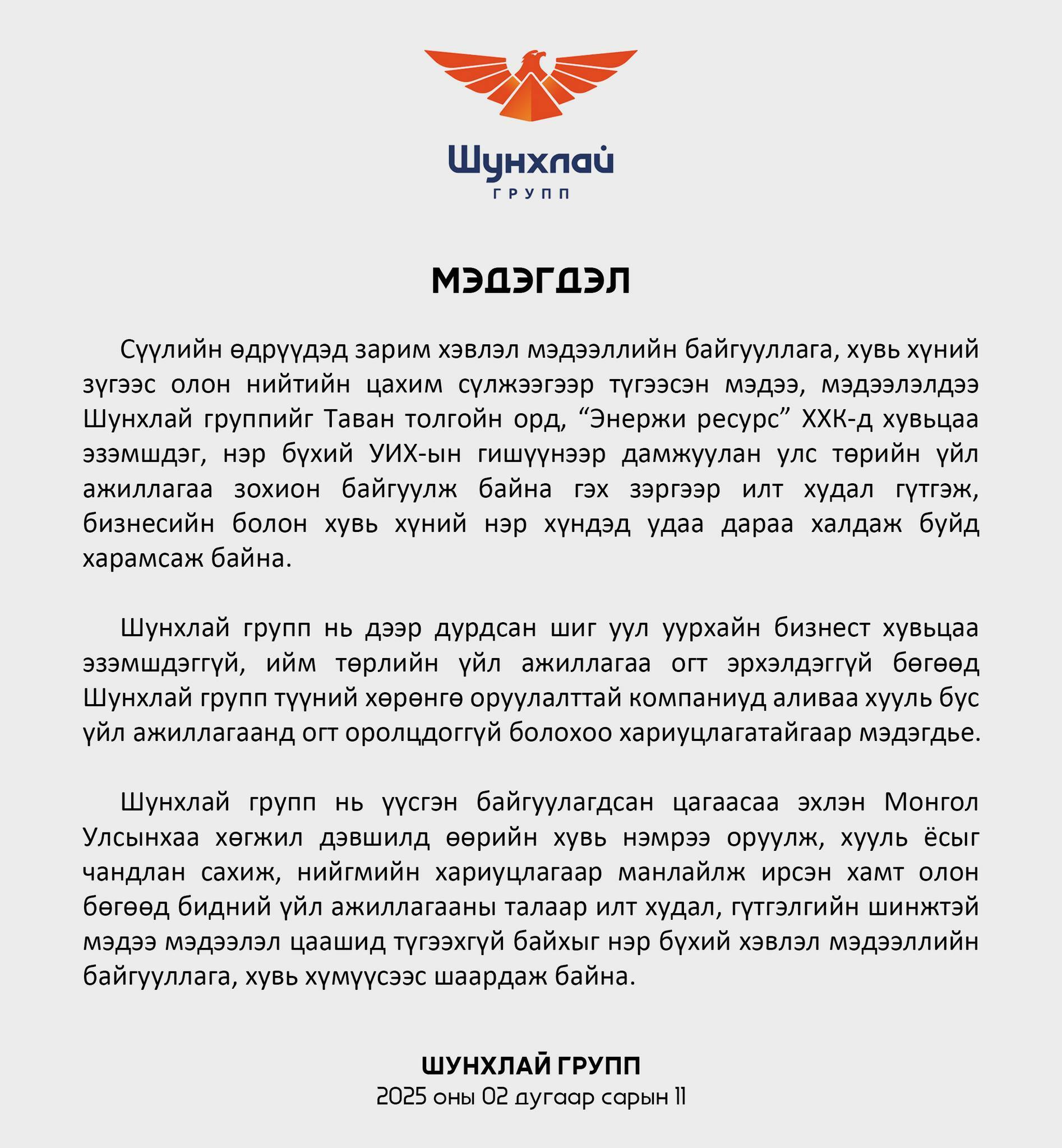 "Шунхлай" группээс мэдэгдэл гаргалаа