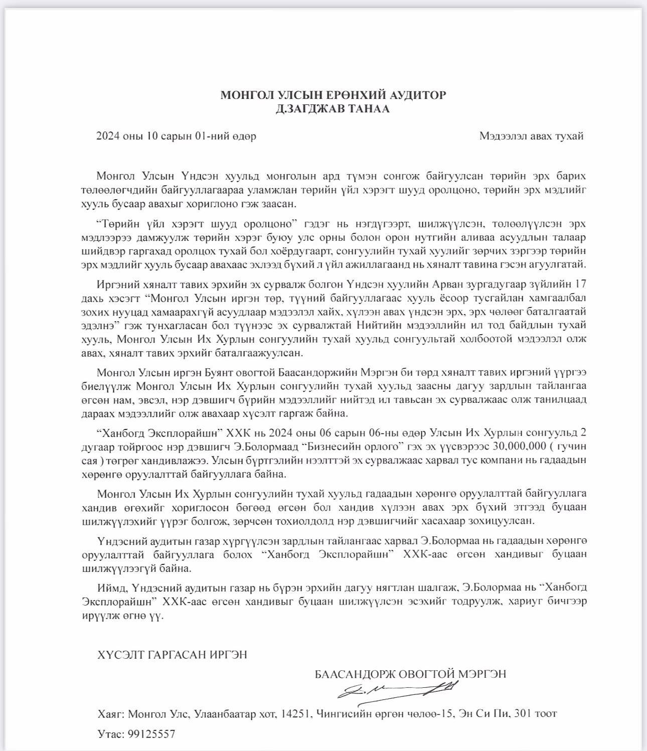 Үндэсний аудитын газар зардлын тайланг хянаж, зөрчлийн талаар дүгнэлт гаргаж, эрх бүхий байгууллагад шилжүүлэх үүрэгтэй боловч ямар нэгэн үйлдэл хийгээгүй байна. Энэ төлөөр өмгөөлөгч Б.Мэргэн ҮАГ-т албан бичиг хүргүүлж байжээ.