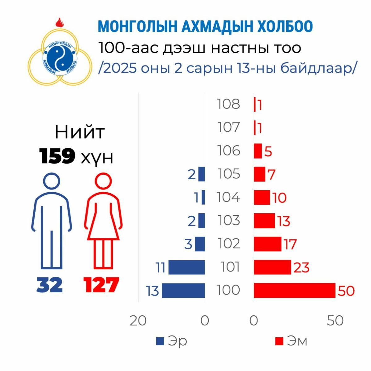 Үүний 127 нь эмэгтэй, 32 нь эрэгтэй иргэн байна. Улаанбаатарт 70, аймгуудад 89 иргэн амьдарч байгаа бөгөөд хамгийн өндөр настай ахмад нь 108 настай байна.