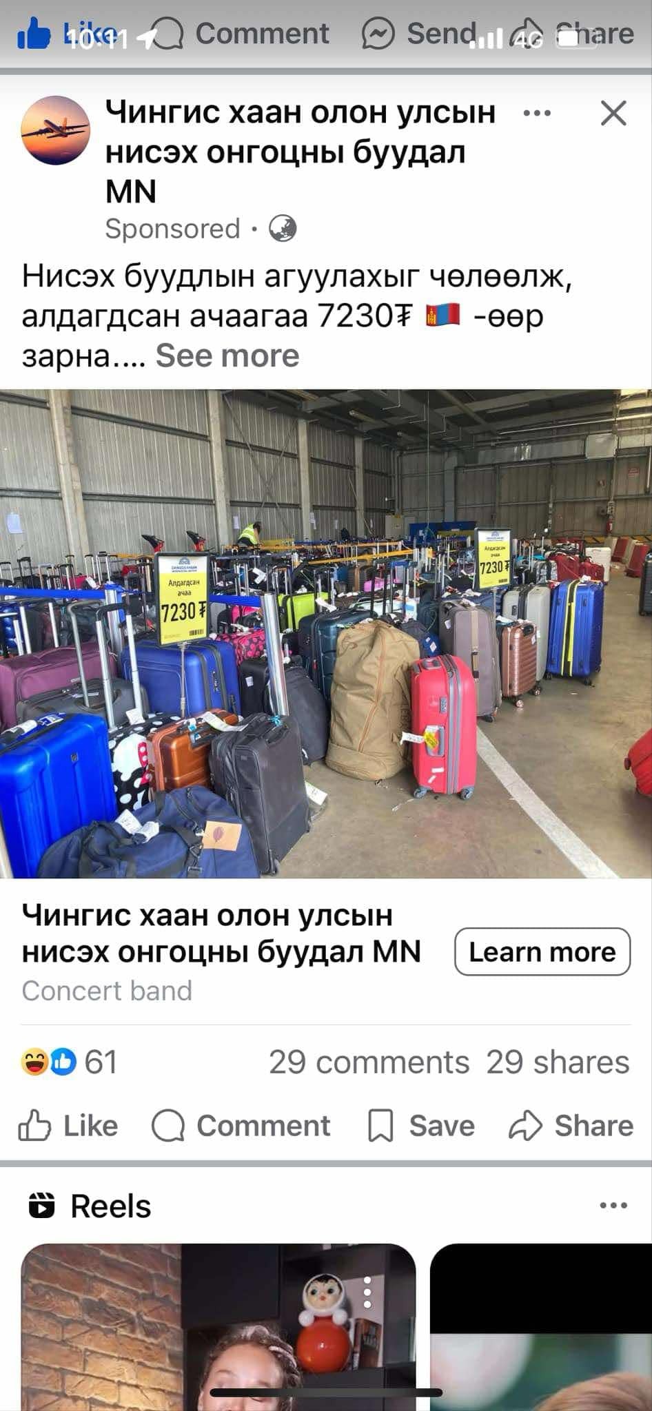 Өнгөрөгч амралтын өдрүүдээр Чингис хаан олон улсын нисэх буудал MN нэртэй фэйсбүүк хуудсанд ‘’нисэх буудлын агуулахыг чөлөөлж, алдагдсан ачааг 7230 төгрөгөөр зарна. Манай бүх чемодан янз бүрийн зүйл, электрон бараагаар дүүрэн байдаг. Улсын хэмжээнд хүргэлттэй, санал зөвхөн сарыг дуустал онлайнаар хүчинтэй’’ гэсэн зар цахим орчинд нийтлэгдсэн. Уг зарын доор хуурамч хаягуудаас ‘’худалдан авалт хийсэн, чемодан дотроос зөөврийн компьютер, алтан ээмэг гарч ирсэн’’ мэтээр зурагтай хэд хэдэн сэтгэгдэл үлдээжээ. Дээрх зарын дагуу эрэл сурал болж, чемодан дотроос алтан ээмэг, элдэв зүйлс олчих санаатай иргэд цахим луйвар гэдгийг нь мэдэхгүйгээр нийтэд түгээж, мөнгө шилжүүлсэн ч байж магадгүй байна. ‘’Үнэгүй юм зөвхөн хавханд байдаг’’ Энэ мэт цахим луйвар нийгмийн сүлжээгээр дүүрэн хөвөрдөг. Тиймээс анхаарал болгоомжтой байх нь зөвхөн иргэн таниас шалтгаална. Харин Чингис хаан олон улсын нисэх буудлын зүгээс нэрийг нь барьж, цахим луйвар хийж буйд иргэдэд сэрэмжлүүлэг хүргээгүй байна. Манай улсад төдийгүй олон улсад иргэдийн мартаж, гээсэн ачаа барааг түр хадгалах хэсэгт байршуулж, эзэнд нь хүлээлгэж өгдөг. Хэзээ ч бусдын мартсан ачааг гуравдагч этгээдэд худалдан борлуулдаггүй.