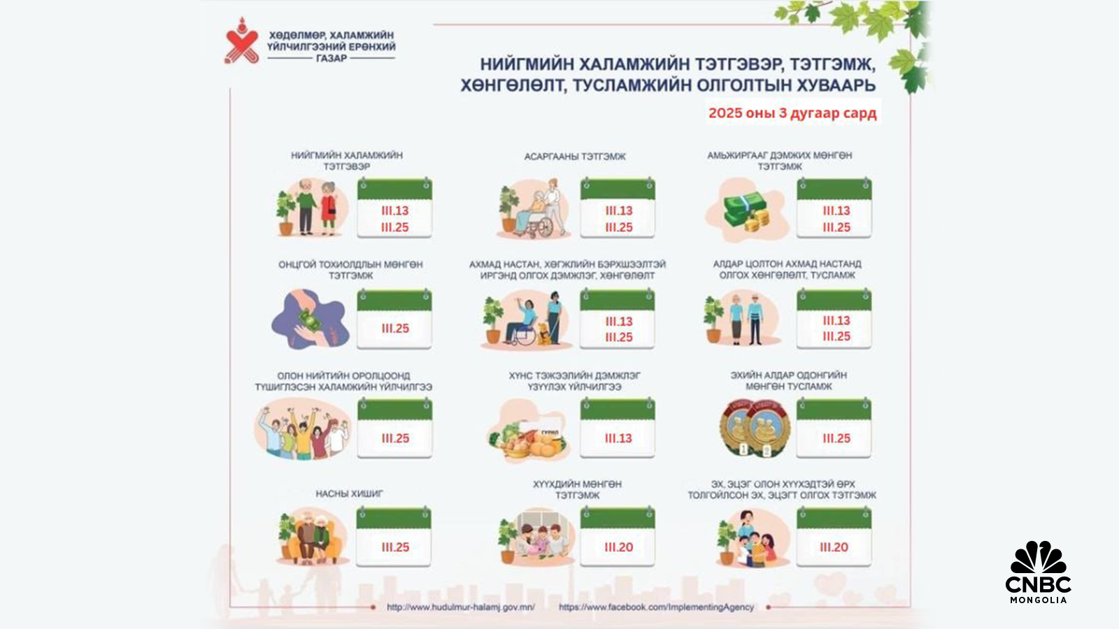- Гуравдугаар сарын 20-нд хүүхдийн мөнгөнөөс гадна олон хүүхэдтэй, ганц бие өрх толгойлсон эцэг, эхэд олгох мөнгөн тэтгэмжийг шилжүүлнэ