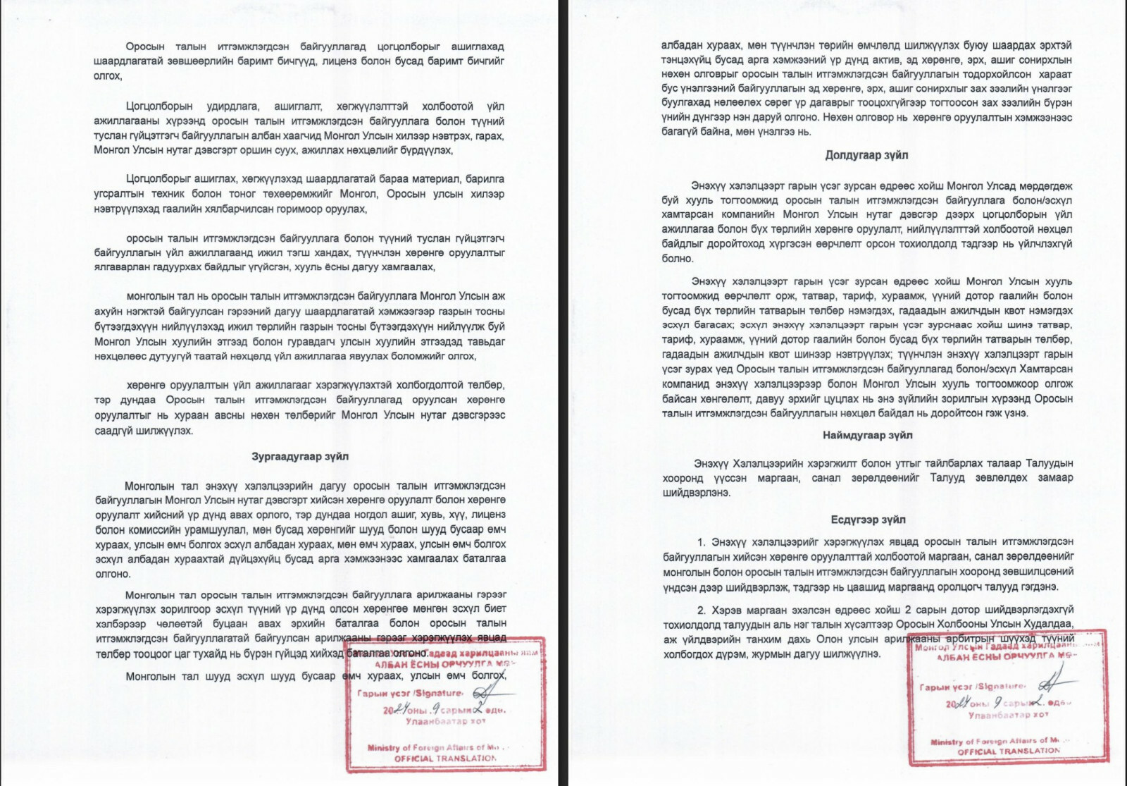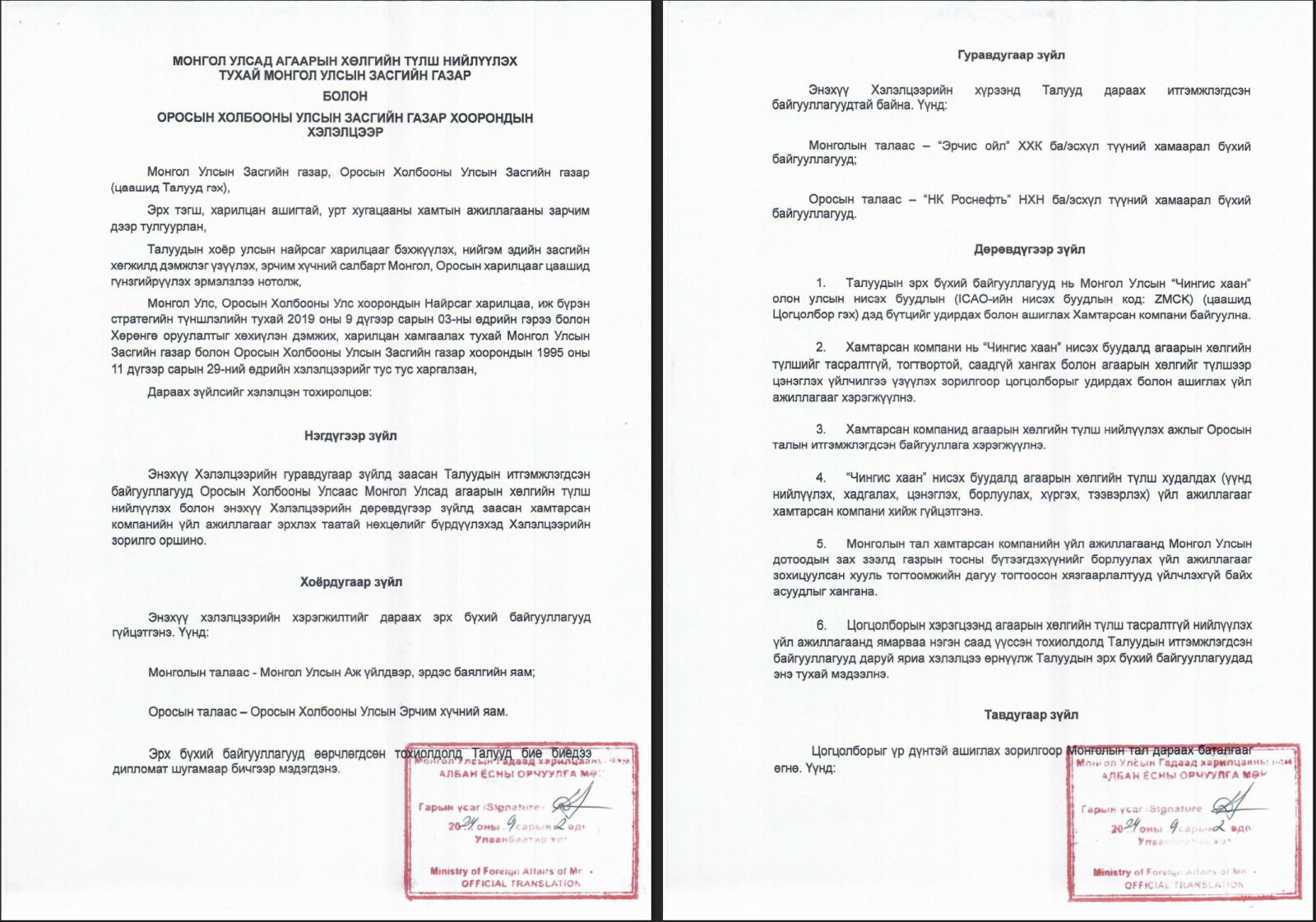 - Талуудын эрх бүхий байгууллагууд нь Монгол Улсын “Чингис хаан” олон улсын нисэх онгоцны цогцолборын дэд бүтцийг удирдах болон ашиглах Хамтарсан компани байгуулна